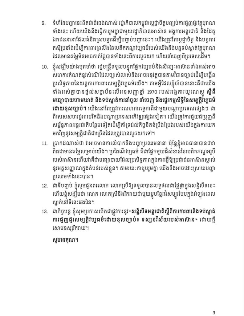 ឯកឧត្តម ឧបនាយករដ្ឋមន្ត្រី សង្ឃឹមយ៉ាងមុតមាំថា រដ្ឋមន្ត្រីទទួលបន្ទុកផ្នែកវប្បធម៌និងសិល្បៈអាស៊ានទាំងអស់អាចសហការកំណត់នូវសំណើដែលច្បាស់លាស់និងអាចអនុវត្តបានតាមវិធានច្បាប់ដើម្បីបង្កើនប្រសិទ្ធភាពនៃយន្តការការពារសម្បត្តិវប្បធម៌យើង។ តាមអ្វីដែលខ្ញុំចាំបាននោះគឺថាយើងទាំងអស់គ្នាបានផ្តល់សច្ចាប័នលើអនុសញ្ញាឆ្នាំ១៩៧០ របស់អង្គការយូណេស្កូ ស្តីពីមធ្យោបាយហាមឃាត់ និងទប់ស្កាត់ការនាំចូល នាំចេញ និងផ្ទេរកម្មសិទ្ធិនៃសម្បត្តិវប្បធម៌ដោយខុសច្បាប់។ យើងនៅតែត្រូវការសហការទ្វេភាគីជាមួយបណ្តាប្រទេសផ្សេងៗ ជាពិសេសសហរដ្ឋអាមេរិកនិងបណ្ដាប្រទេសអភិវឌ្ឍផ្សេងទៀត។ យើងត្រូវការជួយជំរុញពីសម្ព័ន្ធភាពអន្តរជាតិបន្ថែមទៀតដើម្បីគាំទ្រដល់កិច្ចខិតខំប្រឹងប្រែងរបស់យើងក្នុងការយកមកវិញនូវសម្បត្តិជាតិជាច្រើនដែលត្រូវបានលួចយកទៅ។ ប្រាកដណាស់ថា វាអាចមានការលំបាកនិងបញ្ហាប្រឈមនានា ប៉ុន្តែខ្ញុំអាចធានាបានថាវាពិតជាមានតម្លៃសម្រាប់យើង។ ប្រពៃណីវប្បធម៌ គឺជាផ្នែកមួយដ៏សំខាន់នៃបេតិកភណ្ឌអរូបីរបស់អាស៊ានហើយវាគឺជាមធ្យោបាយដែលប្រសិទ្ធភាពក្នុងការធ្វើឱ្យប្រជាជនអាស៊ានស្គាល់នូវអត្តសញ្ញាណក្នុងតំបន់របស់ខ្លួន។ តាមរយៈការរួបរួមគ្នា យើងនឹងអាចដោះស្រាយបញ្ហាប្រឈមទាំងនេះបាន។