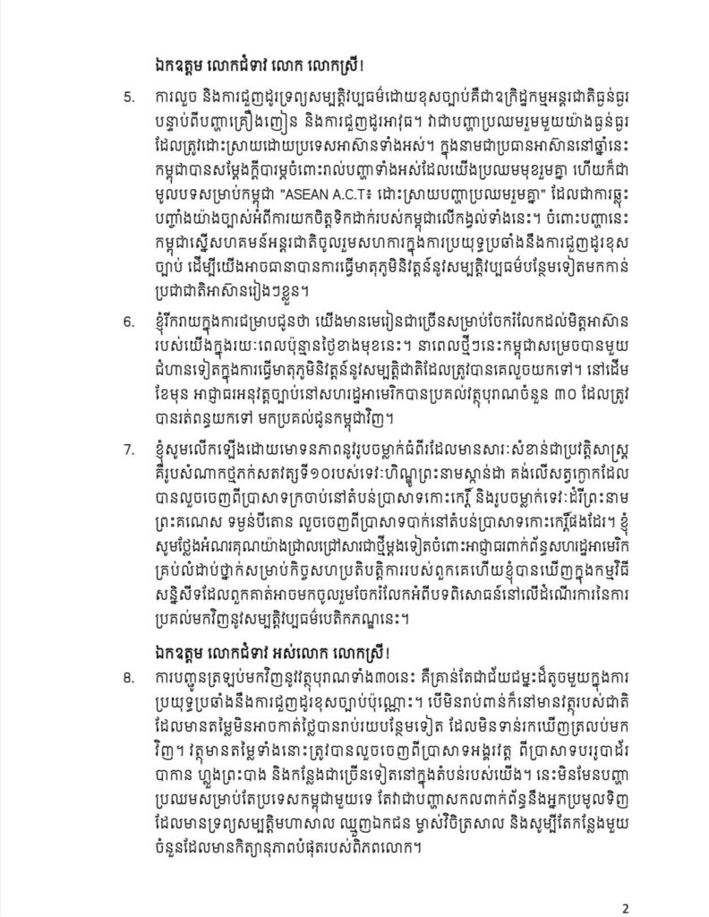 ឯកឧត្តម ឧបនាយករដ្ឋមន្ត្រី ប្រាក់ សុខុន បានបញ្ជាក់ទៀតថា ការលួច និងការជួញដូរទ្រព្យសម្បត្តិវប្បធម៌ដោយខុសច្បាប់ គឺជាឧក្រិដ្ឋកម្មអន្តរជាតិធ្ងន់ធ្ងរបន្ទាប់ពីបញ្ហាគ្រឿងញៀន និងការជួញដូរអាវុធ។ វាជាបញ្ហាប្រឈមរួមមួយយ៉ាងធ្ងន់ធ្ងរ ដែលត្រូវដោះស្រាយដោយប្រទេសអាស៊ានទាំងអស់។ ក្នុងនាមជាប្រធានអាស៊ាននៅឆ្នាំនេះ កម្ពុជាបានសម្ដែងក្ដីបារម្ភចំពោះរាល់បញ្ហាទាំងអស់ដែលយើងប្រឈមមុខរួមគ្នា ហើយក៏ជាមូលបទសម្រាប់កម្ពុជា “ASEAN A.C.T៖ ដោះស្រាយបញ្ហាប្រឈមរួមគ្នា” ដែលជាការឆ្លុះបញ្ចាំងយ៉ាងច្បាស់អំពីការយកចិត្តទិកដាក់របស់កម្ពុជាលើកង្វល់ទាំងនេះ។ ចំពោះបញ្ហានេះ កម្ពុជាស្នើសហគមន៍អន្តរជាតិចូលរួមសហការក្នុងការប្រយុទ្ធប្រឆាំងនឹងការជួញដូរខុសច្បាប់ ដើម្បីយើងអាចធានាបានការធ្វើមាតុភូមិនិវត្តន៍នូវសម្បត្តិវប្បធម៌បន្ថែមទៀតមកកាន់ប្រជាជាតិអាស៊ានរៀងៗខ្លួន។ រដ្ឋមន្ត្រីការបរទេសកម្ពុជាបានអះអាងថា ទំហំនៃបញ្ហានេះពិតជាធំធេងណាស់ រដ្ឋាភិបាលកម្ពុជាប្តេជ្ញាចិត្តបញ្ឈប់ការជួញដូរវត្ថុបុរាណទាំងនេះ ហើយយើងនឹងធ្វើការរួមគ្នាជាមួយរដ្ឋាភិបាលអាស៊ាន អង្គការអន្តរជាតិ និងដៃគូឯកជននានាដែលគំនិតស្របគ្នាដើម្បីបញ្ចប់បញ្ហានេះ។ យើងត្រូវតែប្តេជ្ញាចិត្ត និងបន្តការតស៊ូប្រឆាំងដើម្បីការពារព្រលឹងនៃបេតិកភណ្ឌវប្បធម៌របស់យើងនិងបន្តទប់ស្កាត់វត្ថុបុរាណដែលមានតម្លៃមិនអាចកាត់ថ្លៃបានទាំងនេះពីការលួចយក ហើយនាំចេញពីប្រទេសដើម។