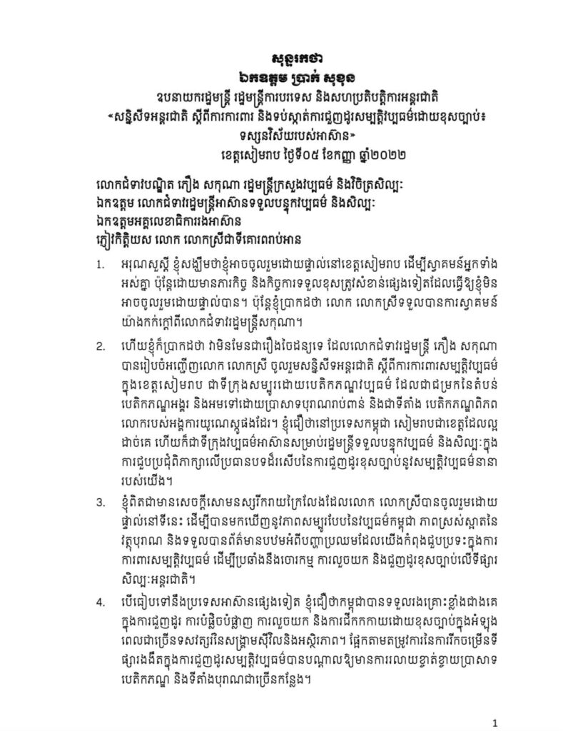 ការបញ្ជាក់នេះ ក្នុងពិធីប្រកាសបើកជាផ្លូវការនូវ «សន្និសីទអន្តរជាតិស្តីពីការការពារ និងទប់ស្កាត់ការជួញដូរសម្បត្តិវប្បធម៌ដោយខុសច្បាប់៖ ទស្សនវិស័យរបស់អាស៊ាន» នៅខេត្តសៀមរាប កាលពីថ្ងៃទី០៥ ខែកញ្ញា ឆ្នាំ២០២២។