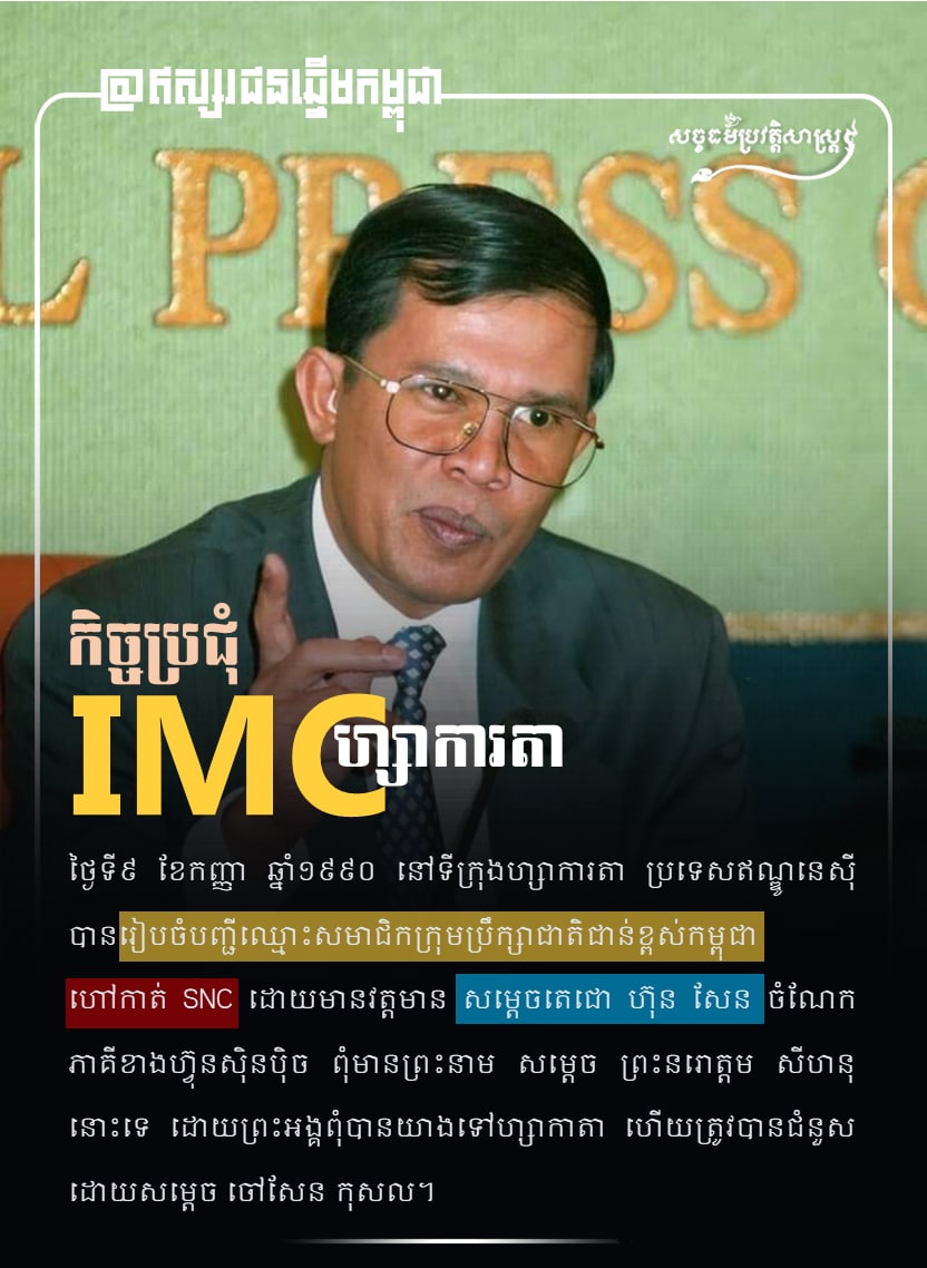 នៅថ្ងៃទី ០៩-១០ ខែ កញ្ញា ឆ្នាំ ១៩៩០ IMC នៅទីក្រុងហ្សាកាតា ប្រទេសឥណ្ឌូនេស៊ី ដើម្បីរៀបចំក្រុមប្រឹក្សាជាតិជាន់ខ្ពស់កម្ពុជា រៀបចំបញ្ជីឈ្មោះសមាជិកក្រុមប្រឹក្សាជាតិជាន់ខ្ពស់ ហៅកាត់ SNC ស្វែងរកដំណោះស្រាយនៃវិបត្តិនយោបាយនៅកម្ពុជាដើម្បីឆ្ពោះទៅរកការរួបរួម និងសុខសន្ដិភាពឡើងវិញ ដោយមានឥស្សរជនឆ្នើមកម្ពុជា សម្ដេចតេជោ ហ៊ុន សែន និងព្រះបាទសម្ដេចព្រះនរោត្តម សីហនុ ព្រះបរមរតនកោដ្ឋ។