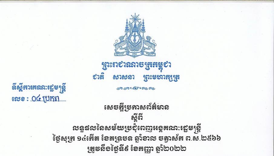 លទ្ធផលកិច្ចប្រជុំគណៈរដ្ឋមន្ត្រី ០៩ កញ្ញាOne-Minuteអត្ថបទដោយ៖AMS OneMinute AMS OneMinuteអត្ថបទមុនអត្ថបទបន្ទាប់