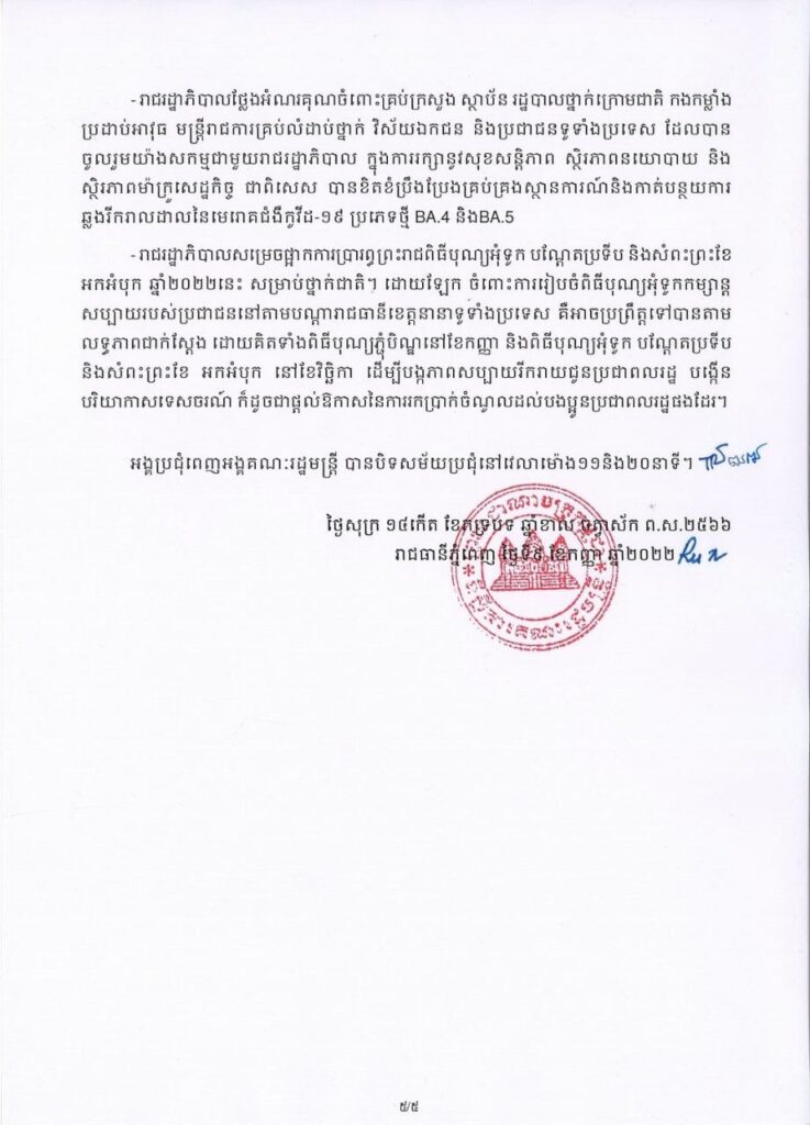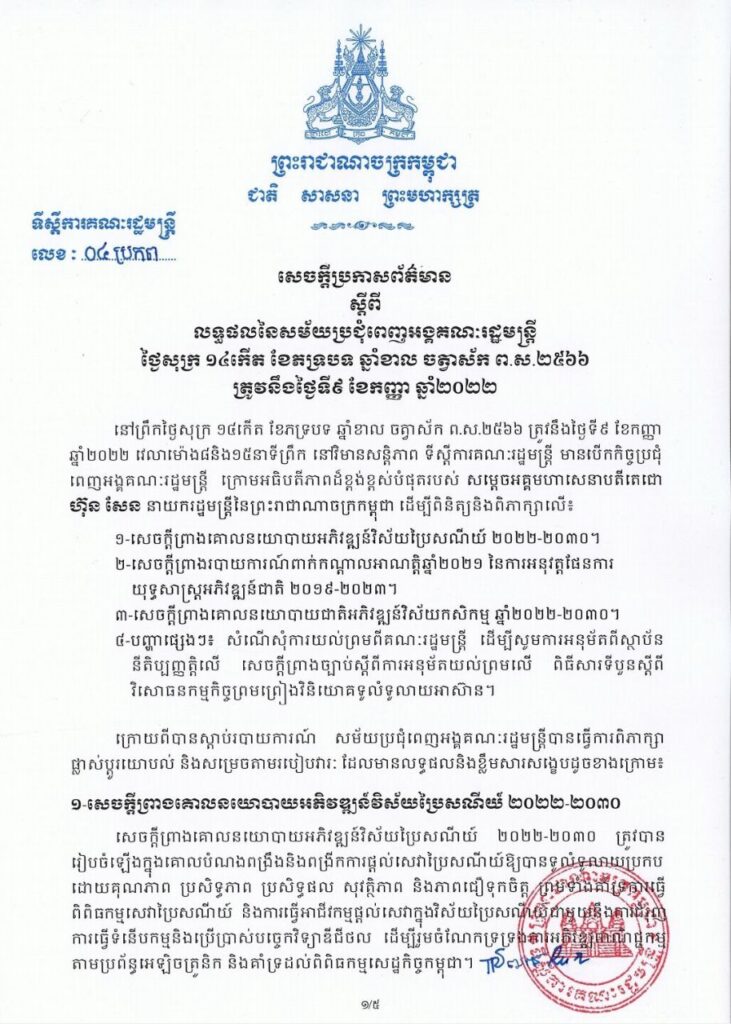 សេចក្ដីប្រកាសព័ត៌មានស្ដីពីលទ្ធផលនៃសម័យប្រជុំពេញអង្គគណៈរដ្ឋមន្ត្រី ថ្ងៃសុក្រ ១៤កើត ខែភទ្របទ ឆ្នាំខាល ចត្វាស័ក ព.ស.២៥៦៦ ត្រូវនឹងថ្ងៃទី៩ ខែកញ្ញា ឆ្នាំ២០២២