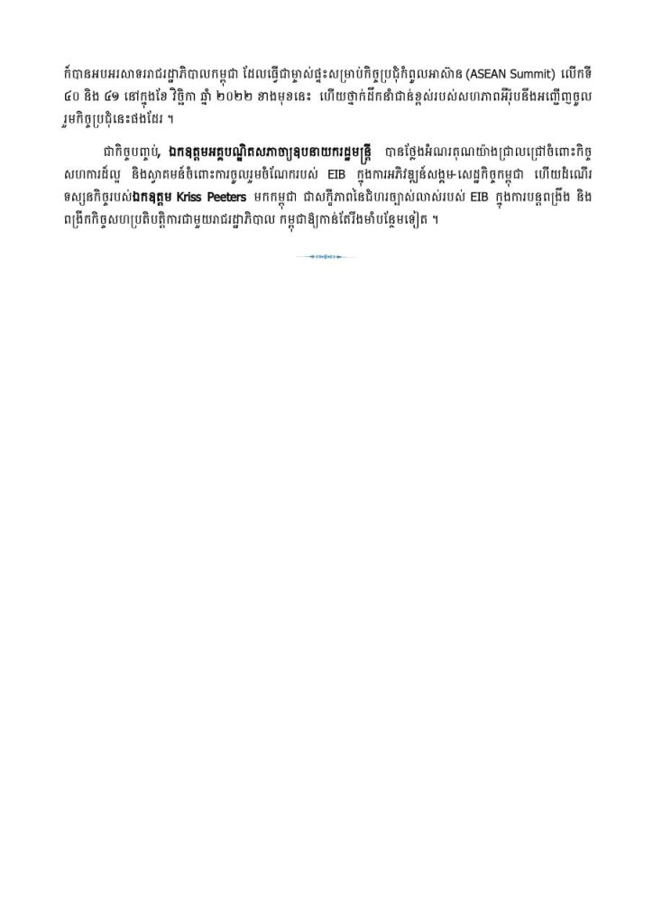 លោក Kriss Peeters បានឱ្យដឹងថា EIB បានត្រៀមរួចជាស្រេចក្នុងការពង្រឹងសហប្រតិបត្ដិការកម្រិតតំបន់ ជាពិសេស ជាមួយកម្ពុជាឱ្យកាន់តែមានភាពរឹងមាំថែមទៀត ខណៈខ្លួនទើបតែបានដាក់សម្ភោធជាផ្លូវការនូវការិយាល័យប្រចាំតំបន់ នៅទីក្រុងចាកាតា ប្រទេសឥណ្ឌូនេស៊ី កាលពីថ្មីនេះ។ លោកបានសម្តែងការ អបអរសាទររាជរដ្ឋាភិបាលកម្ពុជា ដែលធ្វើជាម្ចាស់ផ្ទះសម្រាប់កិច្ចប្រជុំកំពូលអាស៊ាន (ASEAN Summit) លើកទី៤០ និង ៤១ នៅក្នុងខែវិច្ឆិកា ឆ្នាំ២០២២ខាងមុខនេះ ហើយថ្នាក់ដឹកនាំជាន់ខ្ពស់របស់សហភាពអឺរ៉ុបនឹងអញ្ជើញចូលរួមកិច្ចប្រជុំនេះផងដែរ។