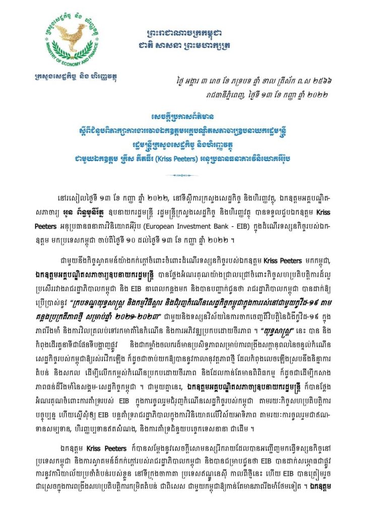 ឯកឧត្តម អគ្គបណ្ឌិតសភាចារ្យ អូន ព័ន្ធមុនីរ័ត្ន បានថ្លែងដូចនេះ ខណៈដែល ឯកឧត្តមបានទទួលជួបពិភាក្សាការងារជាមួយលោក Kriss Peeters អនុប្រធានធនាគារវិនិយោគអឺរ៉ុប (EIB) ក្នុងដំណើរទស្សនកិច្ចរបស់ លោកមកប្រទេសកម្ពុជា ចាប់ពីថ្ងៃទី១០ ដល់ថ្ងៃទី១៣ ខែកញ្ញា ឆ្នាំ២០២២ នាទីស្តីការក្រសួងកាលពីរសៀលថ្ងៃទី១៣ ខែកញ្ញា ឆ្នាំ២០២២ ។