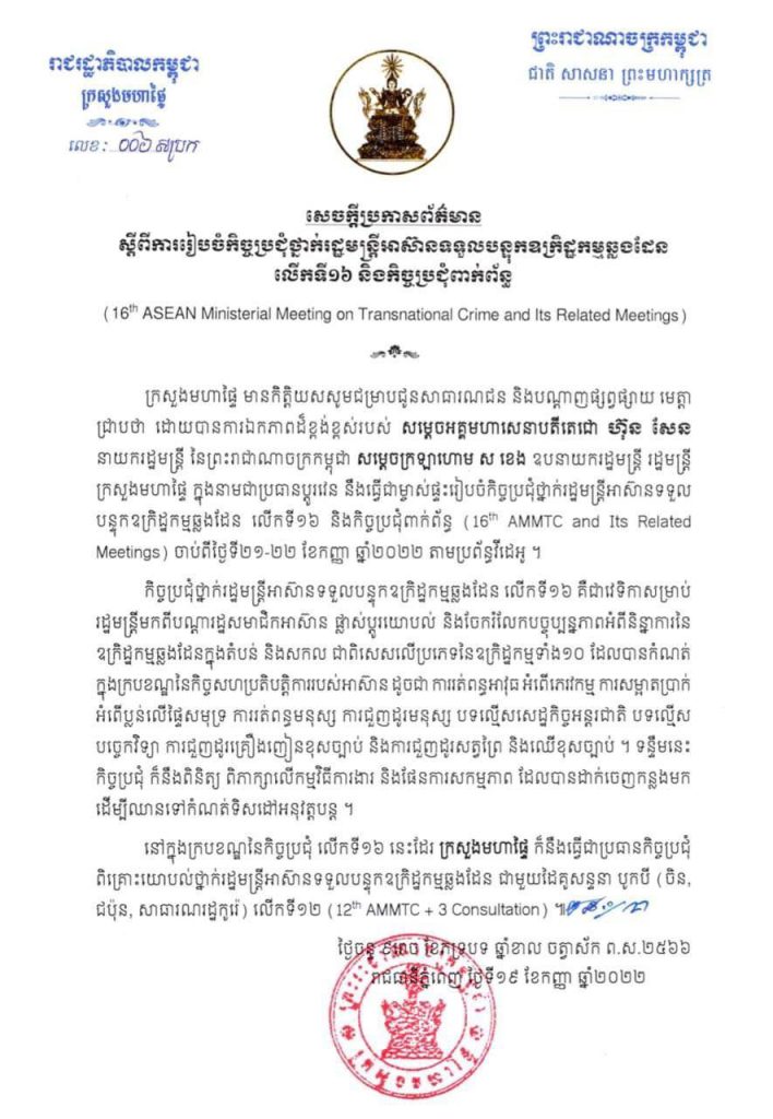 ក្រសួងមហាផ្ទៃ ចេញសេចក្ដីប្រកាសព័ត៌មាន ស្តីពីការរៀបចំកិច្ចប្រជុំ ថា្នក់រដ្ឋមន្ត្រីអាស៊ានទទួលបន្ទុកឧក្រិដ្ឋកម្មឆ្លងដែន លើកទី១៦ និងកិច្ចបជុំពាក់ព័ន្ធ