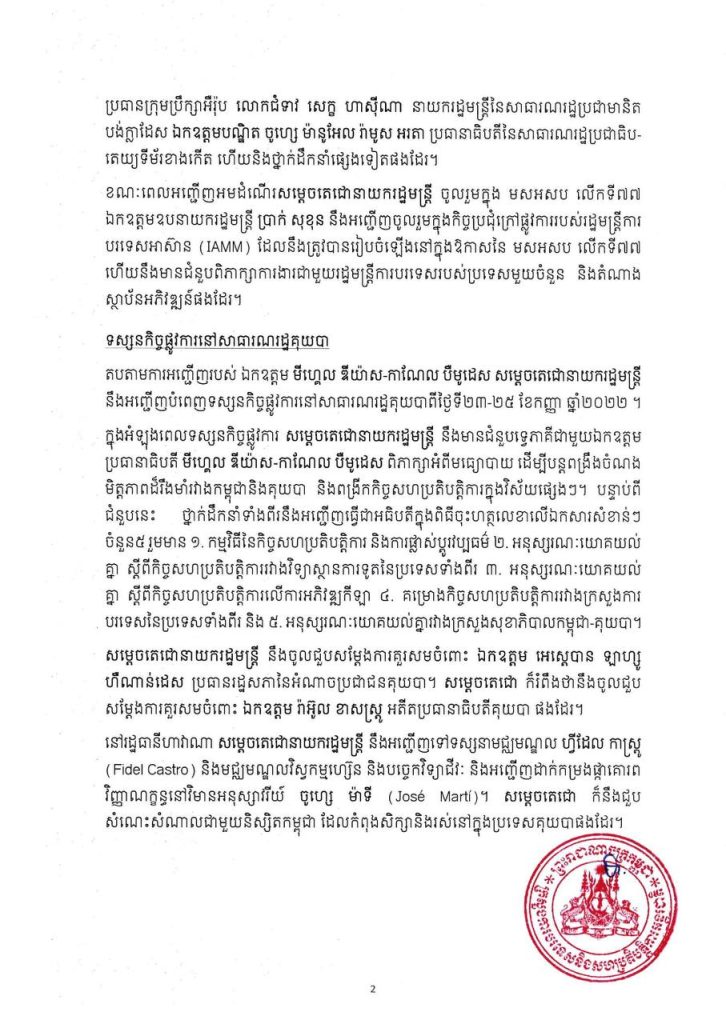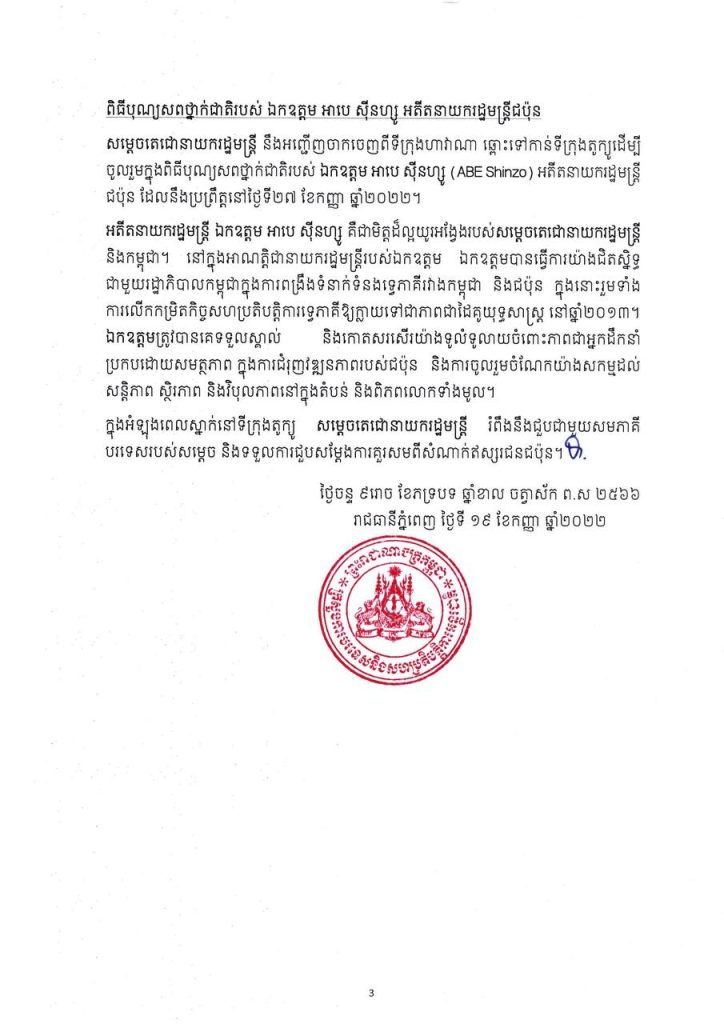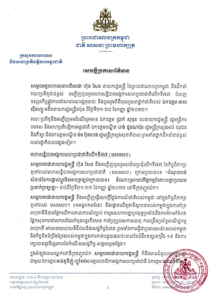 សម្តេចតេជោ នឹងដឹកនាំគណប្រតិភូចូលរួមមហាសន្និបាតអង្គការសហប្រជាជាតិលើកទី៧៧ បំពេញទស្សនកិច្ចផ្លូវការនៅសាធារណរដ្ឋគុយបា និងចូលរួមពិធីបុណ្យសពថ្នាក់ជាតិរបស់លោក អាបេ ចាប់ពីថ្ងៃទី២១-២៨ កញ្ញា ២០២២One-Minuteអត្ថបទដោយ៖AMS OneMinute AMS OneMinuteអត្ថបទមុនអត្ថបទបន្ទាប់