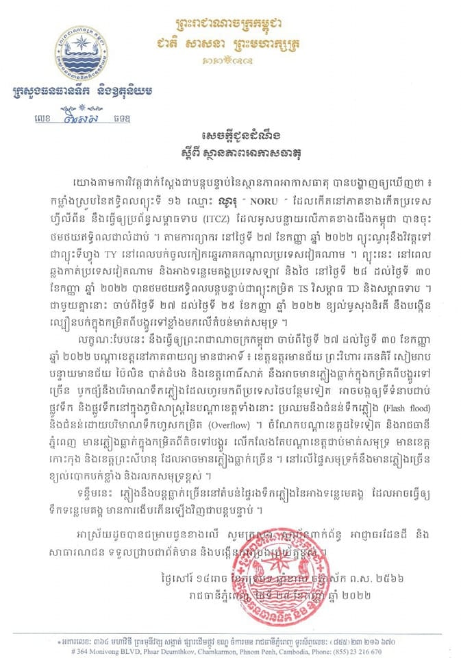 ពីថ្ងៃទី២៧-៣០ កញ្ញា ២០២២ ខេត្តខ្លះនៃប្រទេសកម្ពុជានឹងប្រឈមជំនន់ទឹកភ្លៀង ឯខេត្តកោះកុង និងព្រះសីហនុ នឹងមានខ្យល់បក់បោកខ្លាំង និងរលកសមុទ្រខ្ពស់One-Minuteអត្ថបទដោយ៖AMS OneMinute AMS OneMinuteអត្ថបទមុនអត្ថបទបន្ទាប់