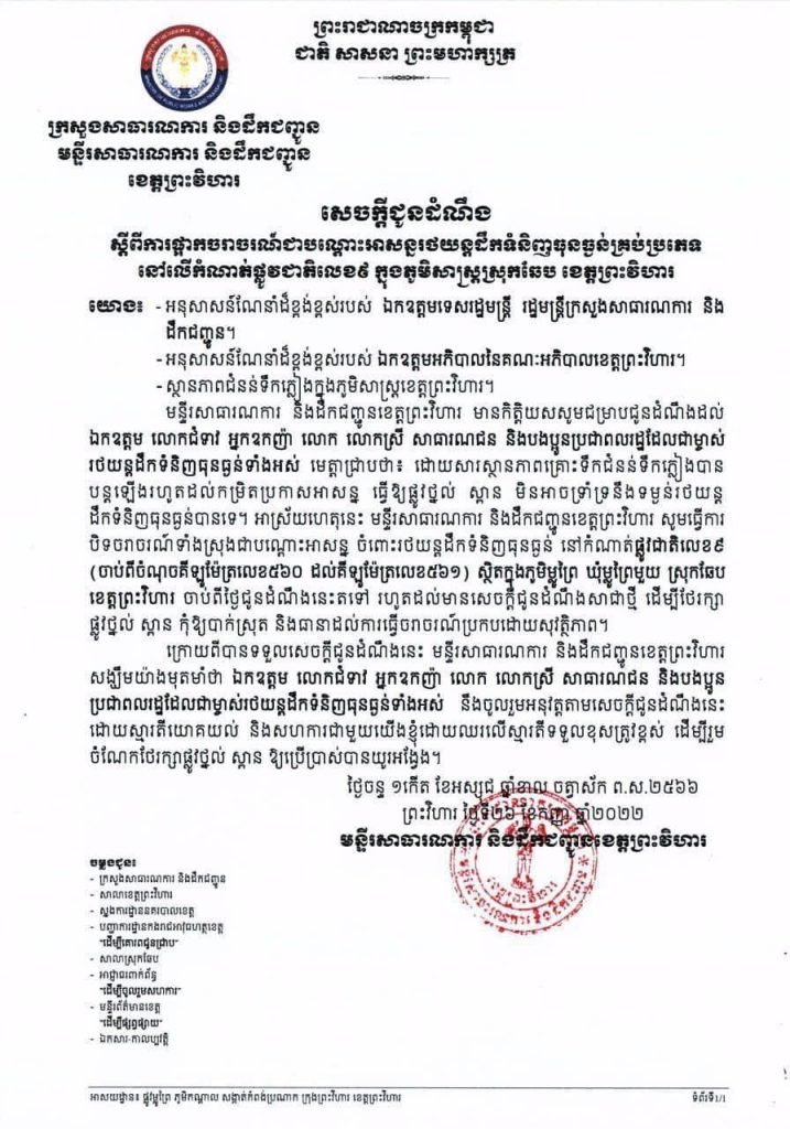 សេចក្តីជូនដំណឹង ស្តីពីការផ្អាកចរាចរណ៍ជាបណ្តោះអាសន្នរថយន្តដឹកទំនិញធុនធ្ងន់គ្រប់ប្រភេទ នៅលើកំណាត់ផ្លូវជាតិលេខ៩ ក្នុងភូមិសាស្ត្រស្រុកឆែប ខេត្តព្រះវិហារ