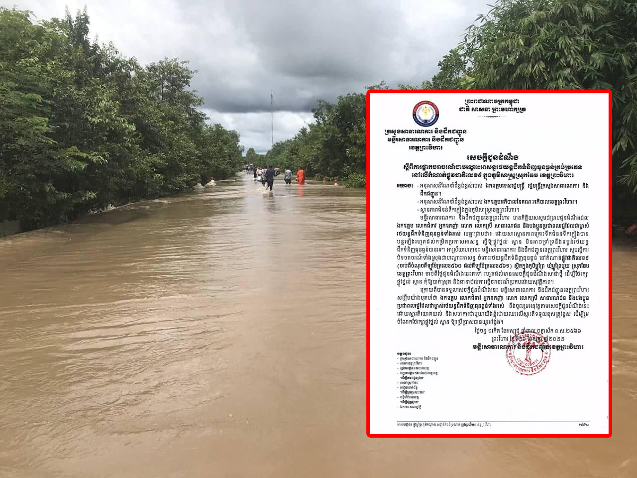 ខេត្តព្រះវិហារ៖ ដើម្បីថែរក្សា ផ្លូវថ្នល់ ស្ពាន កុំឲ្យបាក់ស្រុត និងធានាដល់ការធ្វើចរាចរណ៍ ប្រកបដោយសុវត្ថិភាព មន្ទីរសារធារណការ និងដឹកជញ្ជូនខេត្តព្រះវិហារ បានចេញសេចក្ដីជូនដំណឹង ស្ដីអំពីការផ្អាកចរាចរណ៍ជាបណ្តោះអាសន្ន ចំពោះរថយន្តដឹកទំនិញធុនធ្ងន់ នៅលើកំណាត់ផ្លូវជាតិលេខ៩ ក្នុងភូមិសាស្ត្រ ភូមិម្លូព្រៃ ឃុំម្លូព្រៃមួយ ស្រុកឆែប ចន្លោះគីឡូម៉ែត្រ ៥៦០ ដល់គីឡូម៉ែត្រលេខ ៥៦១ ដោយសារស្ថានភាពជំនន់ទឹកភ្លៀងឡើងលើសកម្រិតប្រកាសអាសន្ន រហូតដល់មានសេក្តីជូនដំណឹងសារជាថ្មី ៕