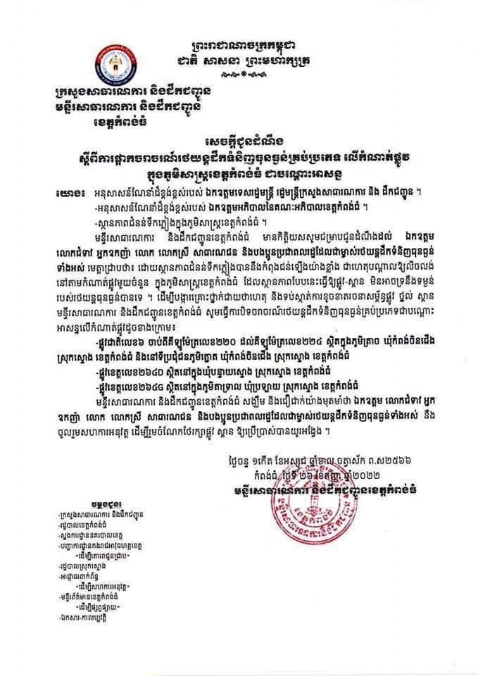 មន្ទីរសាធារណការ និងដឹកជញ្ជូនខេត្តកំពង់ធំ ប្រកាសផ្អាកការចរាចរណ៍រថយន្តដឹកទំនិញធុនធ្ងន់គ្រប់ប្រភេទ ជាបណ្តោះអាសន្ន លើកំណាត់ផ្លូវក្នុងភូមិសាស្រ្តខេត្តកំពង់ធំ !
