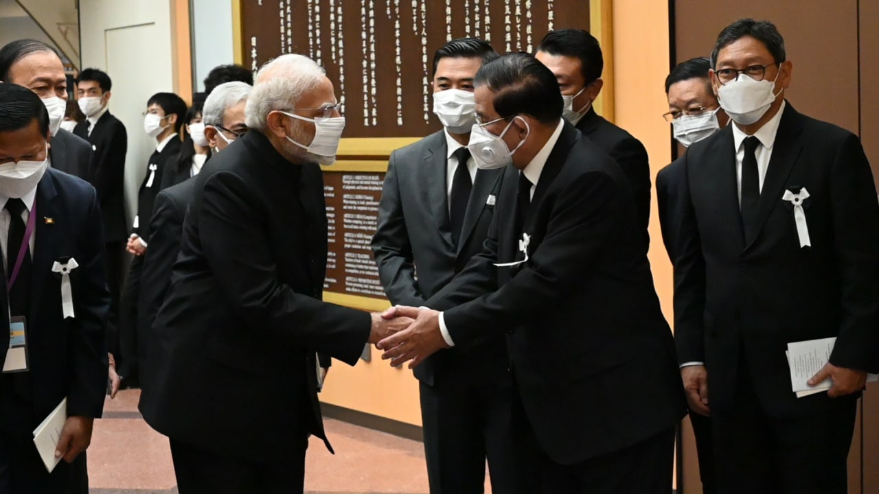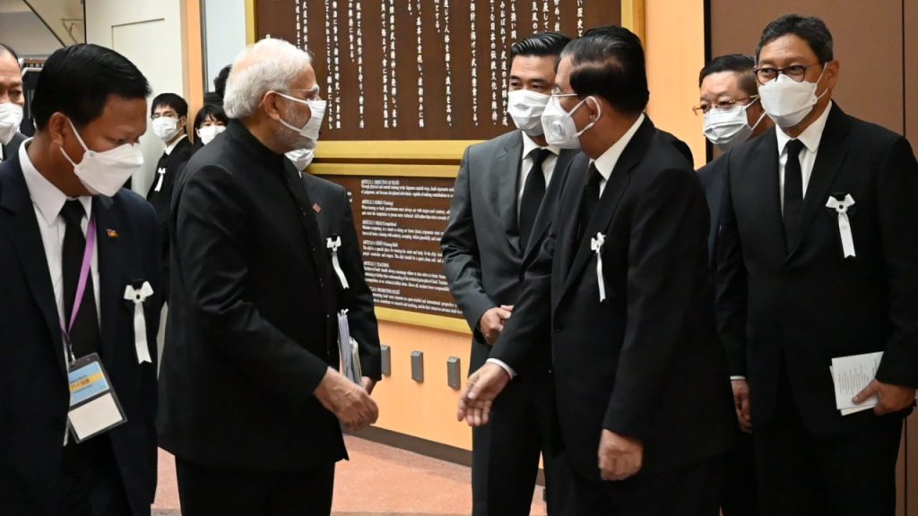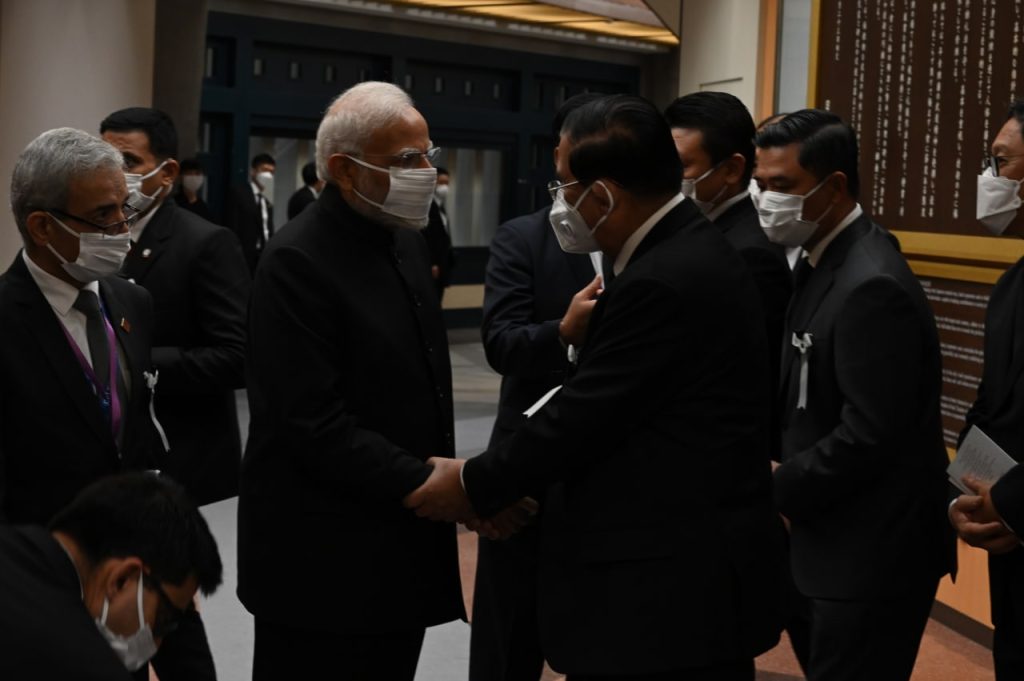 ជប៉ុន៖ បន្ទាប់ពីបានអញ្ជើញមកចូលរួមគោរពវិញ្ញាណក្ខន្ធ និងពិធីបុណ្យសពថ្នាក់ជាតិ អតីតនាយករដ្ឋមន្ត្រីជប៉ុន ឯកឧត្តម អាបេ ស៊ីនហ្សូ ដើម្បីលាគ្នាជាលើកចុងក្រោយរួចមក នៅរសៀលថ្ងៃទី ២៧ កញ្ញា សម្តេចអគ្គមហាសេនាបតីតេជោ ហ៊ុន សែន នាយករដ្ឋមន្ត្រីនៃព្រះរាជាណាចក្រកម្ពុជា បានឆ្លៀតឱកាសជួបសំណេះសំណាល ជាមួយឯកឧត្តម ណារិនដ្រា ម៉ូឌី នាយករដ្ឋមន្ត្រីសាធារណរដ្ឋឥណ្ឌា ក្នុងឱកាសដែលឯកឧត្តម មានវត្តមានចូលរួមក្នុងពិធីបុណ្យសពថ្នាក់ជាតិនេះ ដោយមានការចូលរួមពីថ្នាក់ដឹកនាំជាប្រមុខរដ្ឋ/រដ្ឋាភិបាល អតីតមេដឹកនាំពិភពលោក ប្រមាណ ៥០រូប និងភ្ញៀវកិត្តិយសអន្តរជាតិ ប្រមាណ ៧០០នាក់ និងភ្ញៀវជាតិ សរុបប្រមាណ ៤៥០០នាក់ ៕ ស៊ូ វណ្ណលុក