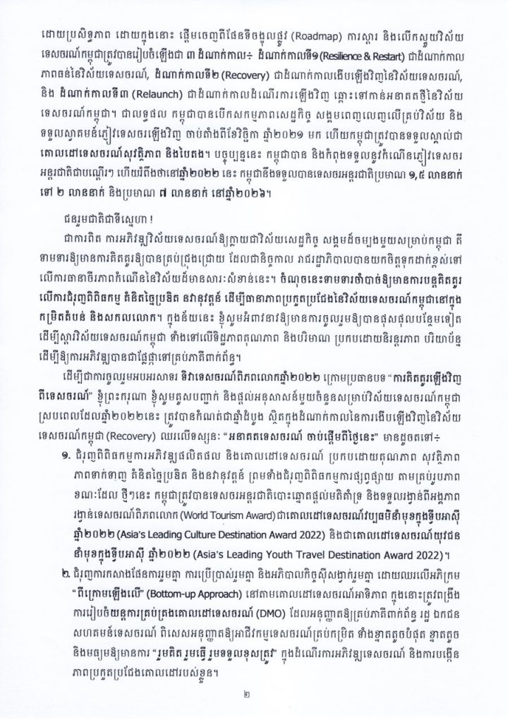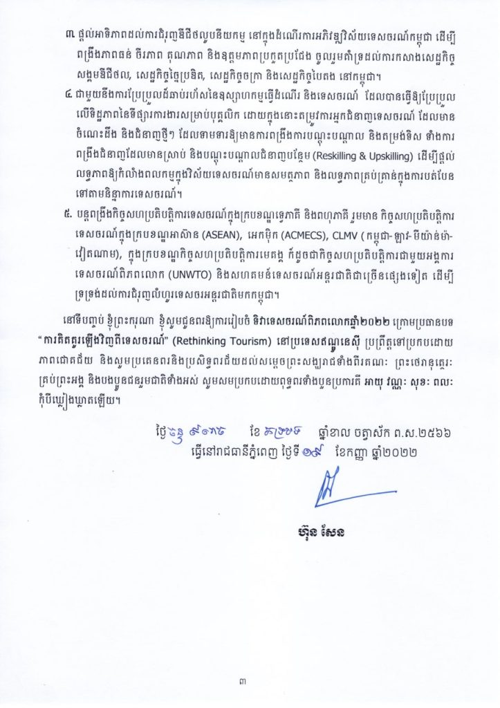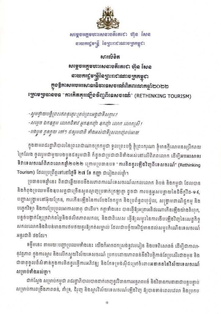 សារលិខិត សម្ដេចអគ្គមហាសេនាបតីតេជោ ហ៊ុន សែន នាយករដ្ឋមន្ត្រីនៃព្រះរាជាណាចក្រកម្ពុជា ក្នុងឱកាសអបអរសាទរទិវាទេសចរណ៍ពិភពលោកឆ្នាំ២០២២ ក្រោមប្រធានបទ ”ការគិតគូរឡើងវិញពីទេសចរណ៍” (RETHINKING TOURISM)