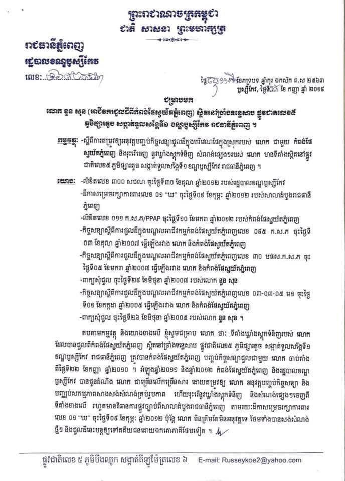 សូមជម្រាបថា រដ្ឋបាលខណ្ឌឫស្សីកែវ តម្រូវឲ្យលោក នួន សុន (អាជីវករជួលដីពីកំពង់ផែស្វយ័តភ្នំពេញ) និងតតិយជនដែលជួលដីបន្ត ធ្វើការរុះរើឃ្លាំងស្តុកទំនិញ និងសំណង់ផ្សេងៗ ចេញពីទីតាំងដីច្រាំងទន្លេសាប ក្នុងរយៈពេល១៥ថ្ងៃ ដោយគិតចាប់ពីថ្ងៃជូនដំណឹងនេះតទៅ។ នេះបើតាមលិខិតផ្លូវការមួយរបស់លោក ជា ពិសី អភិបាលខណ្ឌឫស្សីកែវ និងជាសមាជិកក្រុមលេខាសម្ដេចតេជោ ហ៊ុន សែន នាយករដ្ឋមន្ត្រី នៃកម្ពុជា បានជម្រាបជូន លោក នួន សុន (អាជីវករជួលដីពីកំពង់ផែស្វយ័តភ្នំពេញ) ស្ថិតនៅច្រាំងទន្លេសាប ផ្លូវជាតិលេខ៥ ភូមិផ្សារតូច សង្កាត់ទួលសង្កែទី១ ខណ្ឌឫស្សីកែវ រាជធានីភ្នំពេញ ដែលអ្នកព័ត៌មានទទួលបានកាលពីព្រឹកថ្ងៃទី១៤ ខែកញ្ញា ឆ្នាំ២០១៩។
