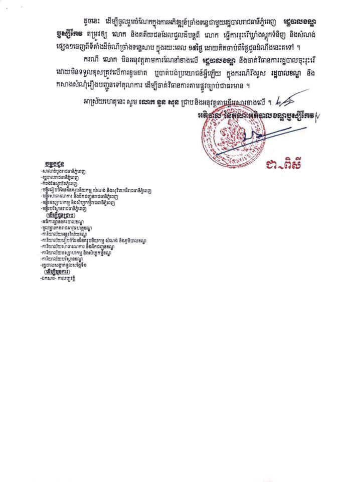 លើសពីនេះ រដ្ឋបាលខណ្ឌឫស្សីកែវ ព្រមានចាត់វិធានការបើលោក នួន សុន (អាជីវករជួលដីពីកំពង់ផែស្វយ័តភ្នំពេញ) មិនអនុវត្តតាមការណែនាំខាងលើ គឺដើម្បីចុះរុះរើឃ្លាំងស្តុកទំនិញ និងសំណង់ផ្សេងៗចេញ ដោយមិនទទួលខុសត្រូវលើការខូចខាត ឫបាត់បង់ប្រយោជន៍អ្វីឡើយ ក្នុងករណីរឹងរូស និងកសាងសំណុំរឿងបញ្ជូនទៅតុលាការ ដើម្បីចាត់ការតាមផ្លូវច្បាប់ជាធរមាន។