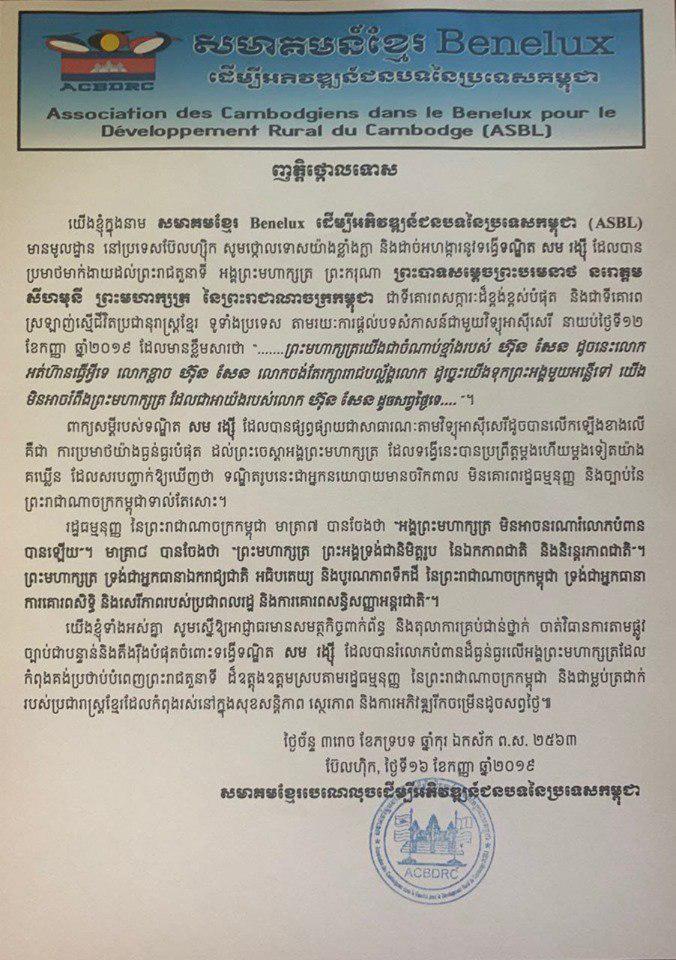 សមាគមខ្មែរ Benelux ដើម្បីអភិវឌ្ឍន៍ជនបទនៃប្រទេសកម្ពុជា ចេញញត្តិថ្កោលទោស យ៉ាងដាច់អហង្ការចំពោះទណ្ឌិតក្បត់ជាតិ សម រង្ស៊ី ដែលប្រមាថព្រះចេស្ដាព្រះមហាក្សត្រនៃកម្ពុជា