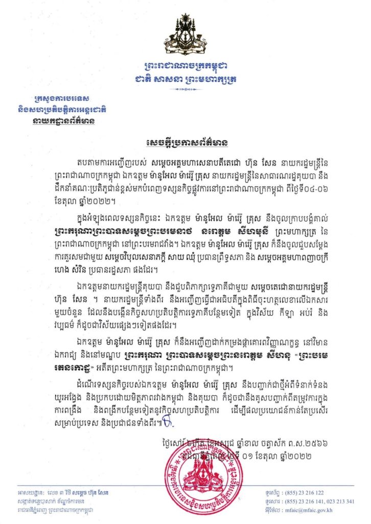 ក្នុងអំឡុងពេលទស្សនកិច្ចនេះ លោក ម៉ានូអែល ម៉ារ៉េរ៉ូ គ្រុស នឹងចូលក្រាបបង្គំគាល់ ព្រះករុណាព្រះបាទសម្តេចព្រះបរមនាថ នរោត្តម សីហមុនី ព្រះមហាក្សត្រកម្ពុជា នៅព្រះបរមរាជវាំង។