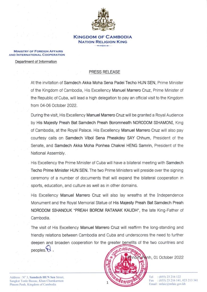 (ភ្នំពេញ)៖ លោក ម៉ានូអែល ម៉ារ៉េរ៉ូ គ្រុស នាយករដ្ឋមន្ត្រីនៃសាធារណរដ្ឋគុយបា នឹងដឹកនាំគណៈប្រតិភូជាន់ខ្ពស់មកបំពេញទស្សនកិច្ចផ្លូវការនៅកម្ពុជា ពីថ្ងៃទី០៤-០៦ ខែតុលា ឆ្នាំ២០២២ ខាងមុខនេះ ដើម្បីពង្រឹង និងពង្រីកទំនាក់ទំនង និងកិច្ចសហប្រតិបត្តិការទ្វេភាគី។