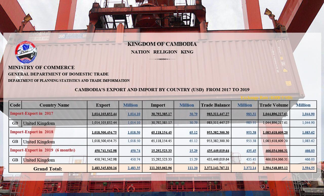 ទំហំពាណិជ្ជកម្មរវាងកម្ពុជានិងអង់គ្លេសមានទំហំ៤៦៥លានដុល្លារក្នុងរយៈពេល៦ខែដើមឆ្នាំ២០១៩នេះ។ យោងតាមអ្នកនាំពាក្យក្រសួងពាណិជ្ជកម្មកម្ពុជា លោក ស៊ាង ថៃ នៅឆមាសទី១ ឆ្នាំ២០១៩នេះ កម្ពុជាបាន នាំចេញទៅអង់គ្លេសចំនួន៤៥០លានដុល្លារ ចំណែកអង់គ្លេសបាននាំចូលមកម្ពុជាមានចំនួន១៥លានដុល្លារ។