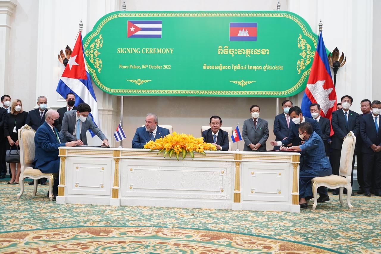 ភ្នំពេញ៖ បន្ទាប់ពីបានបញ្ចប់ជំនួបពិភាក្សាទ្វេភាគីរួចមក សម្តេចអគ្គមហាសេនាបតីតេជោ ហ៊ុន សែន នាយករដ្ឋមន្ត្រី នៃព្រះរាជាណាចក្រកម្ពុជា និងឯកឧត្តម ម៉ានូអែល ម៉ារ៉េរ៉ូ គ្រុស នាយករដ្ឋមន្ត្រីនៃសាធារណរដ្ឋគុយបា បានអញ្ជើញធ្វើជាអធិបតី ក្នុងពិធីចុះហត្ថលេខាលើឯកសារចំនួន ២ រួមមាន ៖
