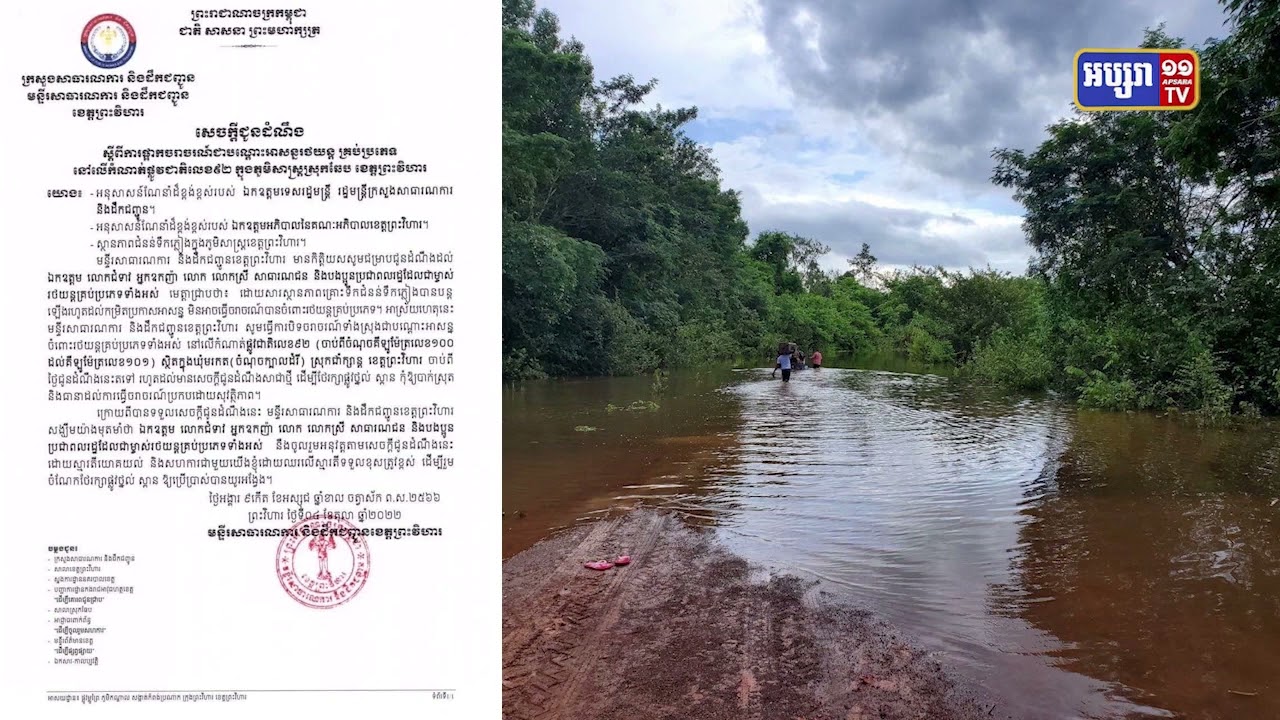 ខេត្តព្រះវិហារបិទការធ្វើចរាចរណ៍កំណាត់ផ្លូវ៩២ដោយសារជំនន់ទឹកភ្លៀងលិចលង់ (Video Inside)