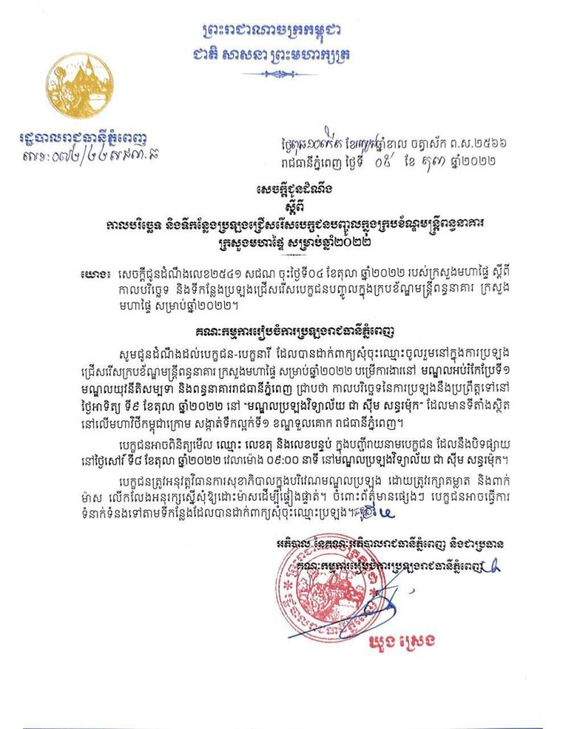 សេចក្តីជូនដំណឹងស្តីពីកាលបរិច្ឆេទ និងទីកន្លែងប្រឡងជ្រើសរើសបេក្ខជនបញ្ជូលក្នុងក្របខ័ណ្ឌមន្ត្រីពន្ធនាគារ ក្រសួងមហាផ្ទៃ សម្រាប់ឆ្នាំ២០២២
