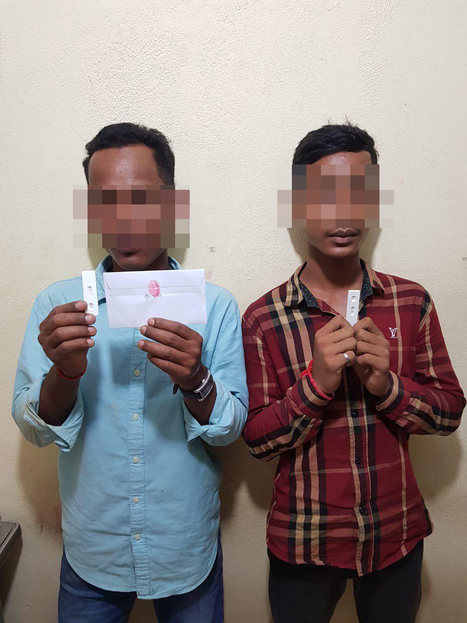 ជនសង្ស័យឈ្មោះ ផៃ សុភា ភេទប្រុស អាយុ១៧ឆ្នាំ មុខរបរកម្មកចាក់សាំង ស្នាក់នៅបន្ទប់ជួល ភូមិជម្ពូវ័ន្ត សង្កាត់ចោមចៅ៣ ខណ្ឌពោធិ៍សែនជ័យ និងឈ្មោះ អ៊ូច មករា ភេទប្រុស អាយុ២៤ឆ្នាំ មុខរបរសន្តិសុខឯកជណ ស្នាក់នៅបន្ទប់ជួល ភូមិរោងចក្រ១ សង្កាត់គោកឃ្លាង ខណ្ឌសែនសុខ។ សមត្ថកិច្ចដកហូតបាន៖ ក្រាមសថ្លា០១កូនថង់តូច និងទូរសព្ទដៃ០១គ្រឿង។
