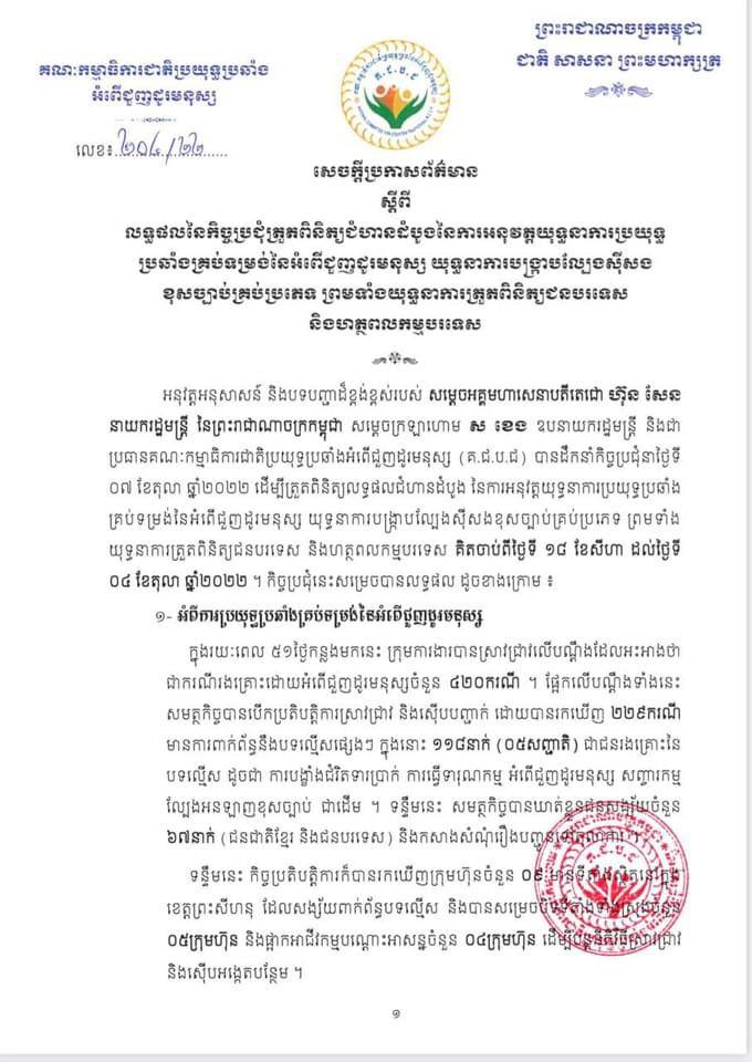 គណៈកម្មាធិការជាតិប្រយុទ្ធប្រឆាំងអំពើជួញដូរមនុស្ស (គ.ជ.ប.ជ) ចេញសេចក្ដីប្រកាសព័ត៌មាន ស្ដីពីលទ្ធផល នៃកិច្ចប្រជុំត្រួតពិនិត្យជំហានដំបូង