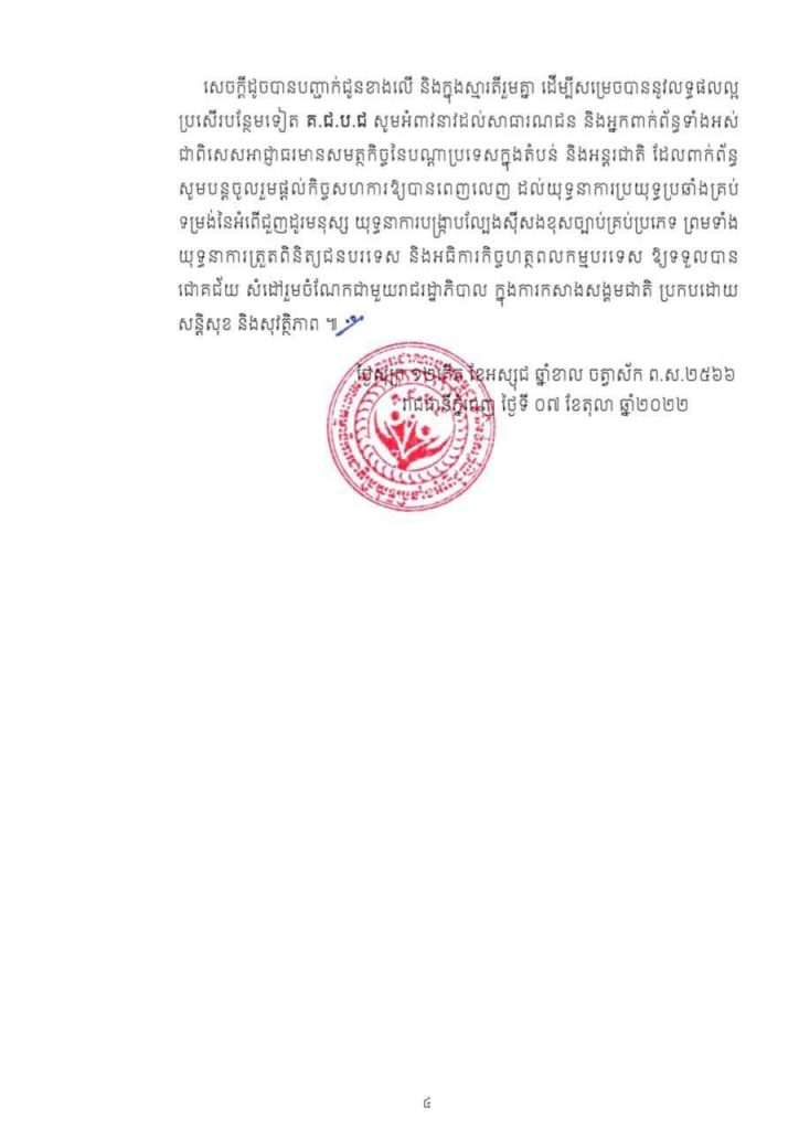 គណៈកម្មាធិការជាតិប្រយុទ្ធប្រឆាំងអំពើជួញដូរមនុស្ស (គ.ជ.ប.ជ) ចេញសេចក្ដីប្រកាសព័ត៌មាន ស្ដីពីលទ្ធផល នៃកិច្ចប្រជុំត្រួតពិនិត្យជំហានដំបូង នៃការអនុវត្តយុទ្ធនាការប្រយុទ្ធ ប្រឆាំងគ្រប់ទម្រង់ នៃអំពើជួញដូរមនុស្ស និងយុទ្ធនាការបង្ក្រាបល្បែងស៊ីសងខុសច្បាប់គ្រប់ប្រភេទ ព្រមទាំងយុទ្ធនាការត្រួតពិនិត្យជនបរទេស និងហត្ថពលកម្មបរទេស គិតចាប់ពីថ្ងៃទី ១៨ ខែសីហា ដល់ថ្ងៃទី០៤ ខែតុលា ឆ្នាំ២០២២ ក្រោយកិច្ចប្រជុំនាព្រឹកថ្ងៃទី០៧ ខែតុលា ឆ្នាំ២០២២ នាទីស្តីការក្រសួងមហាផ្ទៃ ក្រោមអធិបតីភាព សម្ដេចក្រឡាហោម ស ខេង ឧបនាយករដ្ឋមន្ត្រី រដ្ឋមន្ត្រីក្រសួងមហា និងជាប្រធានគណៈកម្មាធិការជាតិប្រយុទ្ធប្រឆាំងអំពើជួញដូរមនុស្ស (គ.ជ.ប.ជ)៕ ដោយ-រ៉ាវុធ