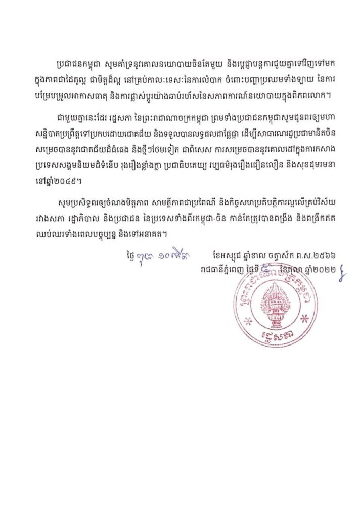 រដ្ឋសភាបានបន្ថែមថា ប្រជាជនកម្ពុជា សូមគាំទ្រនូវគោលនយោបាយចិនតែមួយ និងបេ្តជ្ញាបន្តការជួយគ្នាទៅវិញទៅមកក្នុងភាពជាដៃគូល្អ ជាមិត្តដ៏ល្អ នៅគ្រប់កាលៈទេសៈនៃការលំបាក ចំពោះបញ្ហាប្រឈមទាំងឡាយ នៃការបម្រែបម្រួលអាកាសធាតុ និងការផ្លាស់ប្តូរយ៉ាងឆាប់រហ័សនៃសភាពការណ៍នយោបាយក្នុងពិភពលោក។