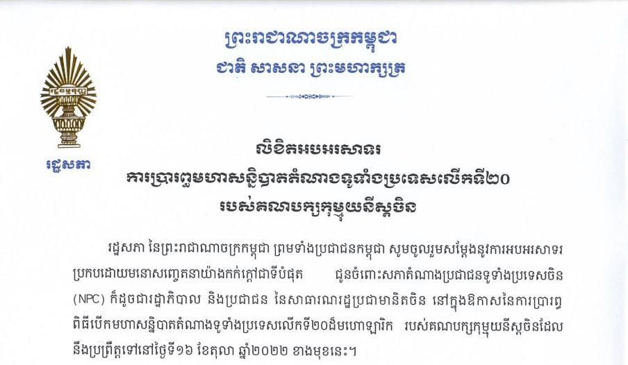 រដ្ឋសភាកម្ពុជា ពិតជាមានជំនឿយ៉ាងមុតមាំថា «មហាសន្និបាតនាឱកាសនេះ នឹងដាក់ចេញនូវយុទ្ធសាស្រ្តស៊ីជម្រៅ និងទិសដៅថ្មីៗប្រកបដោយឆន្ទៈមោះមុត និងការប្តេជ្ញាចិត្តខ្ពស់បន្ថែមទៀត ដើម្បីបន្ថែមល្បឿនក្នុងការពង្រឹងការអភិវឌ្ឍ និងការជំរុញធ្វើយ៉ាងណាឲ្យប្រទេស និងប្រជាជនចិនឈានឆ្ពោះទៅរកភាពកាន់តែសម្បូររុងរឿងបន្ថែមទៀត»។