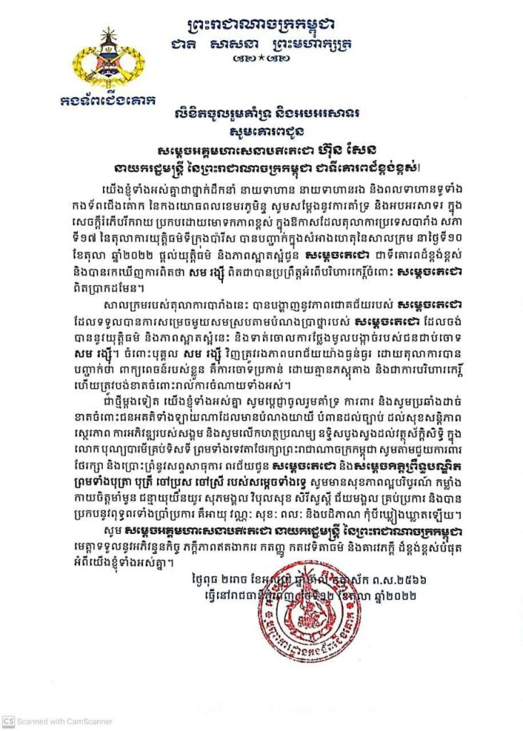ភ្នំពេញ៖ថ្នាក់ដឹកនាំ នាយទាហាន នាយទាហានរង និងពលទាហានទូទាំង កងទ័ពជើងគោក នៃកងយោធពលខេមរភូមិន្ទ សូមសម្តែងនូវការគាំទ្រនិងអបអរសាទរក្នុងសេចក្តីរំភើបរីករាយប្រកបដោយមោទកភាពខ្ពស់ក្នុងឱកាសដែលតុលាការប្រទេសបារាំងសភាទី១៧ នៃតុលាការយុត្តិធម៌ទីក្រុងប៉ារីស បានបញ្ជាក់ក្នុងសំអាងហេតុនៃសាលក្រមនាថ្ងៃទី១០ខែតុលាឆ្នាំ២០២២ ផ្ដល់យុត្តិធម៌ និងភាពស្អាតស្អំជូនសម្តេចតេជោជាទីគោរពដ៏ខ្ពង់ខ្ពស់និងបានរកឃើញការពិតថាសមរង្ស៊ីពិតជាបានប្រព្រឹត្តអំពើ បរិហារកេរ្ដិ៍ចំពោះ សម្តេចតេជោ ពិតប្រាកដមែន។