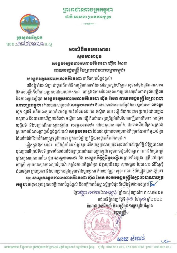 ភ្នំពេញ ៖ យើងខ្ញុំទាំងអស់គ្នា ជាថ្នាក់ដឹកនាំនិងមន្ត្រីរាជការទាំងអស់នៃក្រសួងបរិស្ថាន សូមសម្តែងនូវអំណរសាទរ និងសេចក្តីរំភើបរីករាយប្រកបដោយមោទកភាព នៅក្នុងឱកាសដែលតុលាការប្រទេសបារាំងបានផ្តល់យុត្តិធម៌ និងភាពស្អាតស្អំជូន សម្តេចអគ្គមហាសេនាបតីតេជោ ហ៊ុន សែន នាយករដ្ឋមន្ដ្រីនៃព្រះរាជា ណាចក្រកម្ពុជា ដោយបានសម្រេចថា សម្ដេចតេជោ មិនមានការជាប់ពាក់ព័ន្ធនឹងការស្លាប់របស់ ឯកឧត្តម ហុក ឡង់ឌី ហើយពាក្យពេចន៍ចោទប្រកាន់ទាំងអស់របស់ ទណ្ឌិត សម រង្ស៊ី គឺជាការចោទប្រកាន់ដោយគ្មាន ភស្តុតាង និងបានរកឃើញការពិតថា ទណ្ឌិត សម រង្ស៊ី ពិតជាបានប្រព្រឹត្តអំពើបរិហារកេរ្តិ៍ប្រាកដមែន។