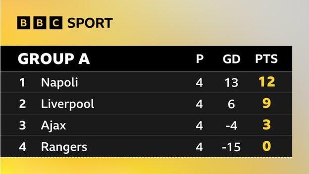 រីឯក្រុម Napoli បានកក់កៅអីវគ្ក១៦ក្រុមចុងក្រោយ ក្រោយ៤ប្រកួតឈ្នះទាំង៤ ឈរលេខ១ មាន១២ពិន្ទុ ទោះបីសល់១ប្រកួតទៀតក៏ដោយ។ គួរបញ្ជាក់ថា ប្រកួតបន្ទាប់ ក្រុម Liverpool ត្រូវប៉ះម្ចាស់ផ្ទះ Ajax រីឯក្រុម Napoli ប៉ះ Rangers នាថ្ងៃទី២៧ ខែតុលាខាងមុខនេះ៕ ចាន់ វិចិត្រ