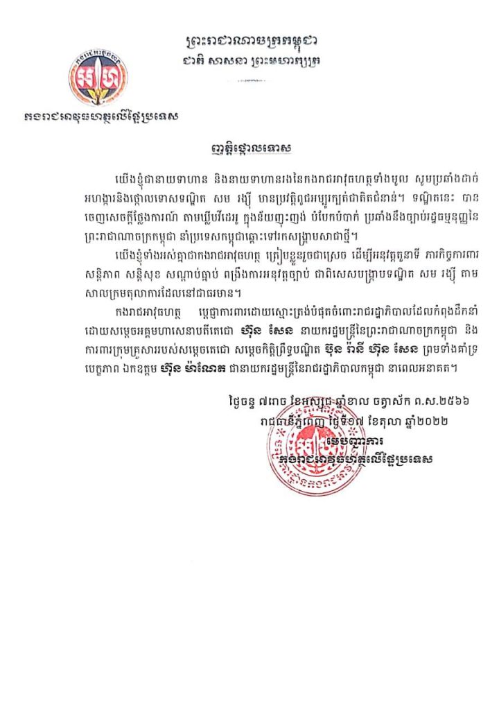 តាមរយៈញត្តិថ្កោលទោស នៅរសៀលថ្ងៃទី១៧ ខែតុលា ឆ្នាំ២០២២នេះ បានបញ្ជាក់ថា៖យើងខ្ញុំជានាយទាហាន និងនាយទាហានរងនៃកងរាជអាវុធហត្ថទាំងមូល សូមប្រឆាំងដាច់ អហង្ការនិងថ្កោលទោសទណ្ឌិត សម រង្ស៊ី មានប្រវត្តិពូជអម្បូរក្បត់ជាតិតជំនាន់។ ទណ្ឌិតនេះ បានចេញសេចក្តីថ្លែងការណ៍ តាមឃ្លីបវីដេអូ ក្នុងន័យញុះញង់ បំបែកបំបាក់ ប្រឆាំងនឹងច្បាប់រដ្ឋធម្មនុញ្ញន ព្រះរាជាណាចក្រកម្ពុជា នាំប្រទេសកម្ពុជាឆ្ពោះទៅរកសង្គ្រាមសាជាថ្មី។