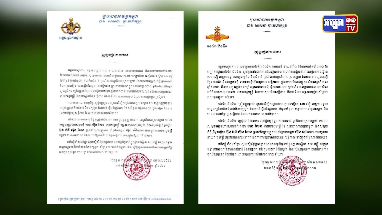 ញ្ញត្តិរបស់ កងកម្លាំងយោធពលខេមរភូមិន្ទ បានហៅសមរង្ស៊ី ជាមេឧទ្ទាមនៃពូជក្បត់ជាតិ៣ជំនាន់ និង បានប្តេជ្ញាការពារសម្តេចតេជោហ៊ុនសែនជាស្ថាបនិកសន្តិភាព និងជាមនុស្សដែលមានការ គោរពស្រលាញ់ពីប្រជាពលរដ្ឋកម្ពុជាគ្រប់រូប។ កងកម្លាំងយោធពលខេមរភូមិន្ទ បានប្តេជ្ញានិង អំពាវនាវការចាប់ខ្លួនទណ្ឌិត សម រង្ស៉ី និងបក្សពួកបើសិនជាហ៊ានជាន់ទឹកដីនៃប្រទេសកម្ពុជា វិញនោះ។