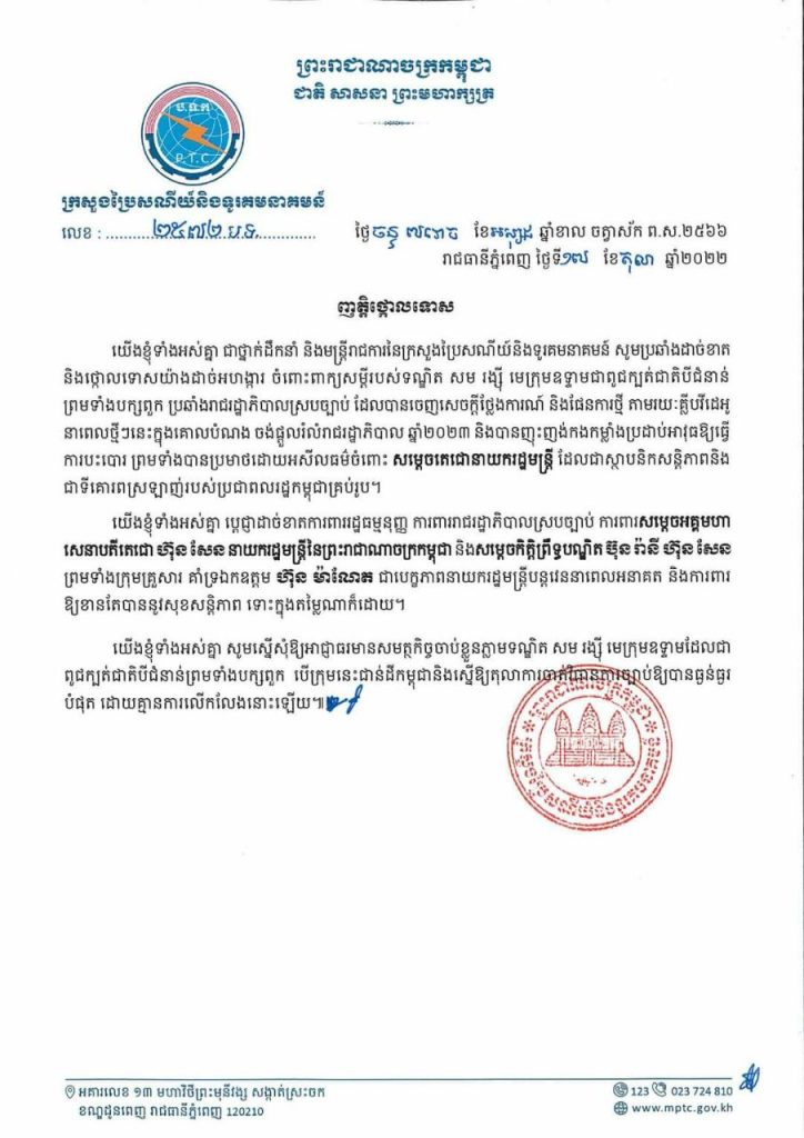 ភ្នំពេញ៖ក្រសួងប្រៃសណីយ៍និងទូរគមនាគមន៍នៅថ្ងៃទី ១៧ ខែតុលា ឆ្នាំ ២០២២បានចេញញត្តិមួយដោយធ្វើការថ្កោលទោសទណ្ឌិត សម រង្ស៊ីដែលមានបំណងចង់ផ្ដួលរលំរាជរដ្ឋាភិបាលនៅឆ្នាំ២០២៣ និងបានញុះញង់កងកម្លាំងប្រដាប់អាវុធឱ្យធ្វើការបះបោរ។