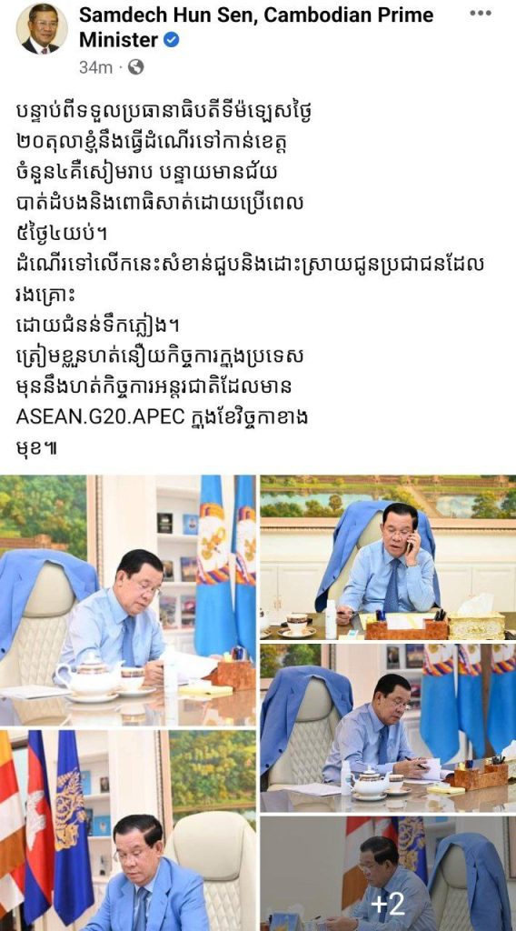សម្តេចតេជោ ហ៊ុន សែន សរសេរដូច្នេះថា៖ បន្ទាប់ពីទទួលប្រធានាធិបតីទីម័រឡេសថ្ងៃ២០តុលា ខ្ញុំនឹងធ្វើដំណើរទៅកាន់ខេត្តចំនួន៤ គឺសៀមរាប បន្ទាយមានជ័យ បាត់ដំបង និងពោធិ៍សាត់ដោយប្រើពេល៥ថ្ងៃ៤យប់។