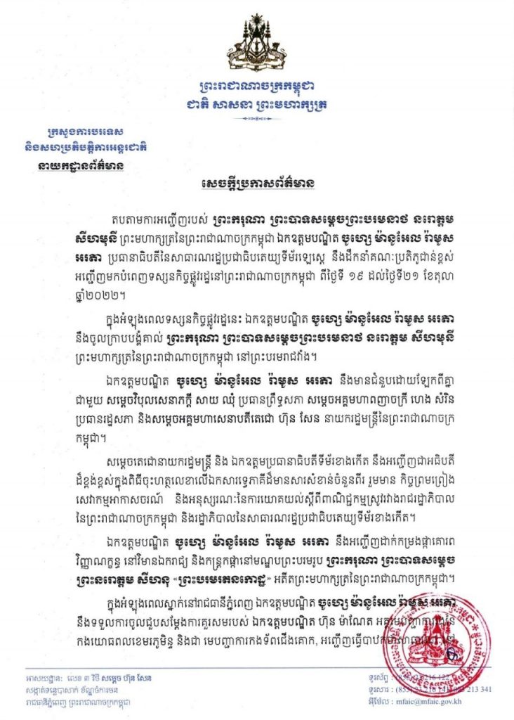 ភ្នំពេញ៖ យោងតាមសេចក្តីប្រកាសព័ត៌មានរបស់ក្រសួងការបរទេស និងសហប្រតិបត្តិការអន្តរជាតិ ដែលចេញផ្សាយនៅថ្ងៃទី១៨ ខែតុលា ឆ្នាំ២០២២ បានឱ្យដឹងថា តបតាមការអញ្ជើញរបស់ ព្រះករុណា ព្រះបាទសម្តេច ព្រះបរមនាថ នរោត្តម សីហមុនី ព្រះមហាក្សត្រនៃព្រះរាជាណាចក្រកម្ពុជា ឯកឧត្តមបណ្ឌិត ចូហ្សេ ម៉ានូអែល រ៉ាមូស អរតា ប្រធានាធិបតីនៃសាធារណរដ្ឋប្រជាធិបតេយ្យទីម័រឡេស្តេ នឹងដឹកនាំគណៈប្រតិភូជាន់ខ្ពស់អញ្ជើញមកបំពេញទស្សនកិច្ចផ្លូវរដ្ឋនៅព្រះរាជាណាចក្រកម្ពុជា ពីថ្ងៃទី ១៩ ដល់ថ្ងៃទី២១ ខែតុលា ឆ្នាំ២០២២។