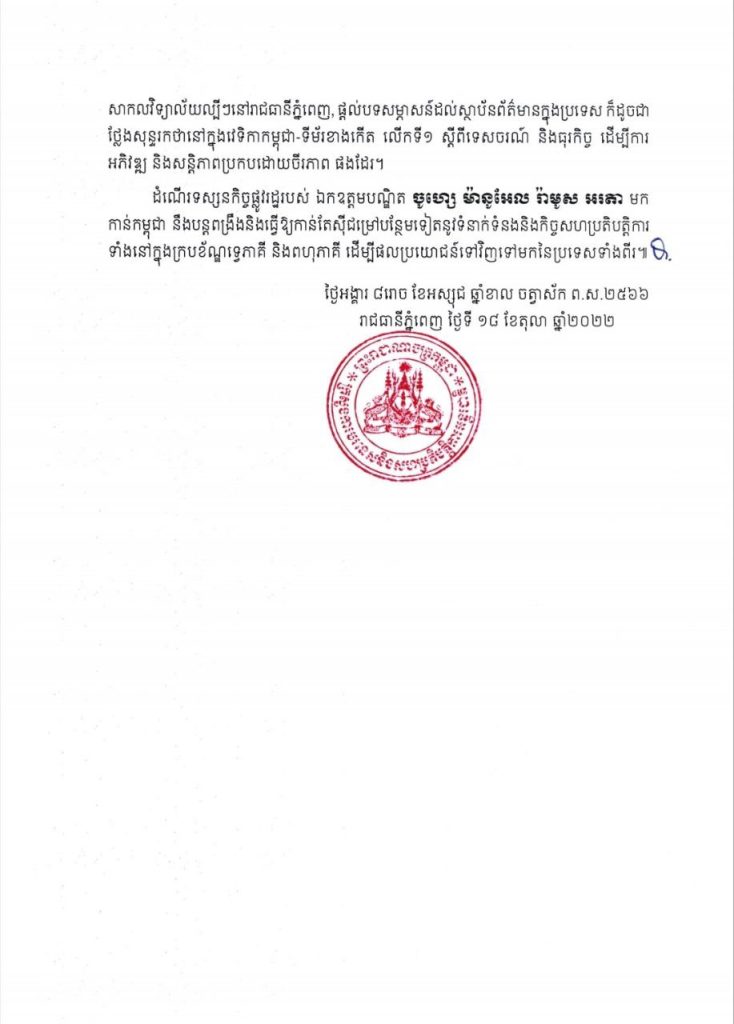 ដំណើរទស្សនកិច្ចផ្លូវរដ្ឋរបស់ ឯកឧត្តមបណ្ឌិត ចូហ្សេ ម៉ានូអែល រ៉ាមូស អរតា មកកាន់កម្ពុជា នឹងបន្តពង្រឹងនិងធ្វើឱ្យកាន់តែស៊ីជម្រៅបន្ថែមទៀតនូវទំនាក់ទំនងនិងកិច្ចសហប្រតិបត្តិការ ទាំងនៅក្នុងក្របខ័ណ្ឌទ្វេភាគី និងពហុភាគី ដើម្បីផលប្រយោជន៍ទៅវិញទៅមកនៃប្រទេសទាំងពីរ៕ ដោយ សួង ពិសិដ្ឋ