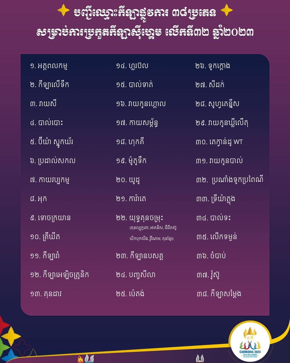បញ្ជីឈ្មោះកីឡាផ្លូវការទាំង ៣៨ប្រភេទ សម្រាប់ ការ ប្រ កួត កីឡា ស៊ីហ្គេមលើកទី៣២ ឆ្នាំ២០២៣ 📝 🇰🇭One-Minuteអត្ថបទដោយ៖AMS OneMinute #ams1minute AMS OneMinuteអត្ថបទមុនអត្ថបទបន្ទាប់