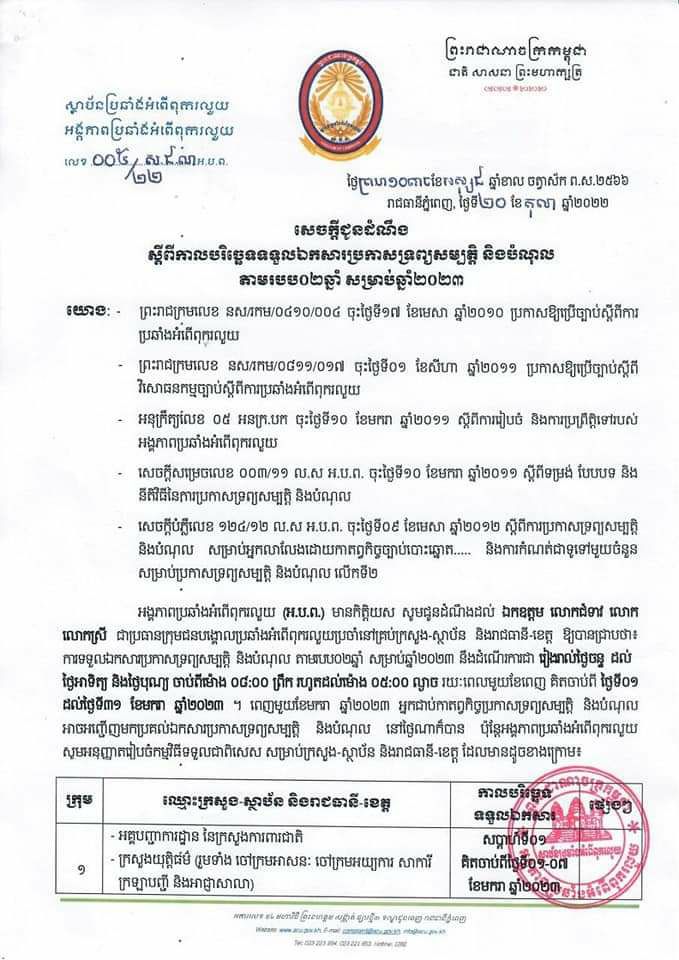 បើយោងតាមសេចក្តីជូនដំណឹងចេញផ្សាយនៅថ្ងៃទី ២០ ខែតុលាឆ្នាំ ២០២២ដែលបានចុះហត្ថលេខាដោយប្រធានអង្គភាពប្រឆាំងអំពើពុករលួយ កិត្តិនីតិកោសលបណ្ឌិត ឱម យ៉ិន ទៀងបានបញ្ជាក់ថា៖អង្គភាពប្រឆាំងអំពើពុករលួយ (អ.ប.ព.) មានកិត្តិយស សូមជូនដំណឹងដល់ ឯកឧត្តម លោកជំទាវ លោក លោកស្រី ជាប្រធានក្រុមជនបង្គោលប្រឆាំងអំពើពុករលួយប្រចាំនៅគ្រប់ក្រសួង-ស្ថាប័ន និងរាជធានី-ខេត្ត ឱ្យបានជ្រាបថា៖ ការទទួលឯកសារប្រកាសទ្រព្យសម្បត្តិ និងបំណុល តាមរបប០២ឆ្នាំ សម្រាប់ឆ្នាំ២០២៣ នឹងដំណើរការជា រៀងរាល់ថ្ងៃចន្ទ ដល់ ថ្ងៃអាទិត្យ និងថ្ងៃបុណ្យ ចាប់ពីម៉ោង ០៨:០០ ព្រឹក រហូតដល់ម៉ោង ០៥:០០ ល្ងាច រយៈពេលមួយខែពេញ គិតចាប់ពី ថ្ងៃទី០១ ដល់ថ្ងៃទី៣១ ខែមករា ឆ្នាំ២០២៣។