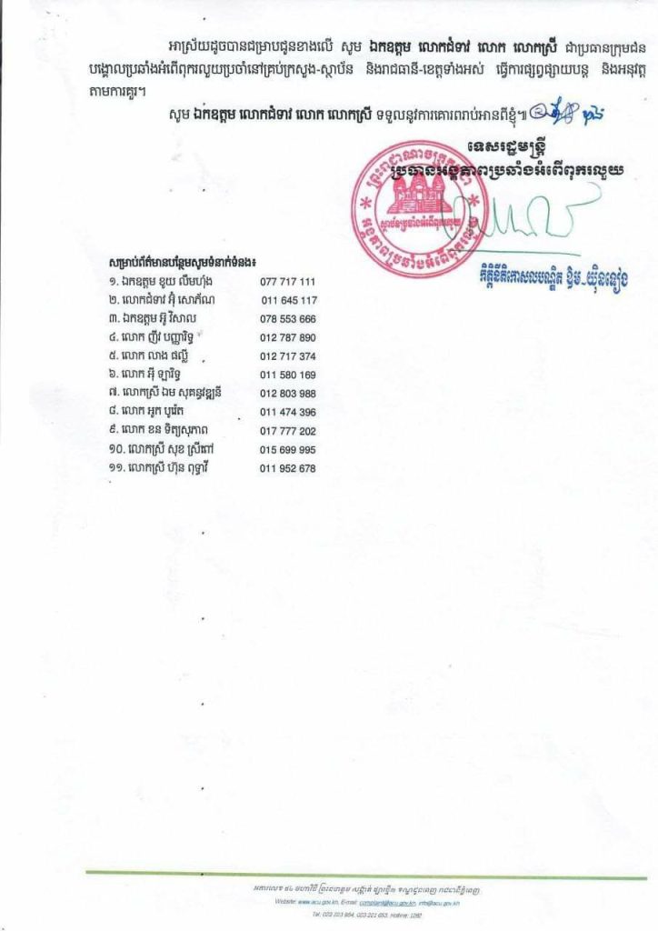 សេចក្តីជូនដំណឹងខាងលើនេះបានបញ្ជាក់បន្ថែមថា៖ពេញមួយខែមករា ឆ្នាំ២០២៣ អ្នកជាប់កាតព្វកិច្ចប្រកាសទ្រព្យសម្បត្តិ និងបំណុល អាចអញ្ជើញមកប្រគល់ឯកសារប្រកាសទ្រព្យសម្បត្តិ និងបំណុល នៅថ្ងៃណាក៏បាន ប៉ុន្តែអង្គភាពប្រឆាំងអំពើពុករលួយ សូមអនុញ្ញាតរៀបចំកម្មវិធីទទួលជាពិសេស សម្រាប់ក្រសួង-ស្ថាប័ន និងរាជធានី-ខេត្ត ៕ (សូមមើលសេចក្តីជូនដំណឹងខាងក្រោម)