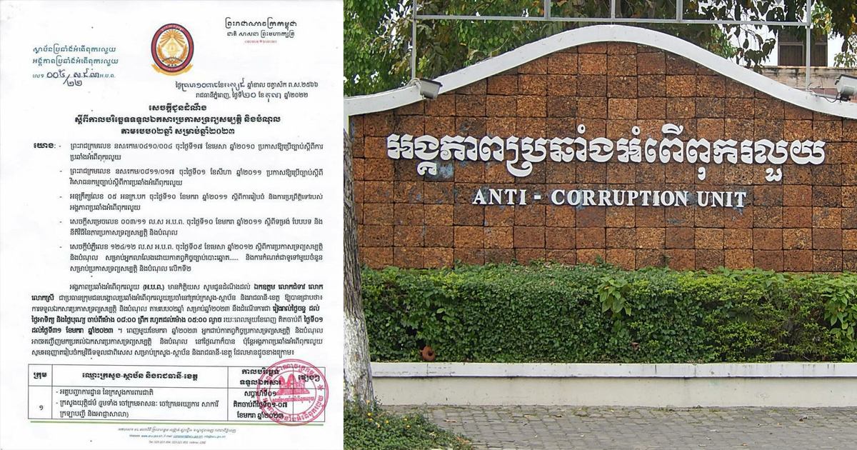 ភ្នំពេញ៖ អង្គភាពប្រឆាំងអំពើពុករលួយ (អ.ប.ព.)បានចេញសេចក្តីជូនដំណឹងមួយស្តីពីការប្រកាសទ្រព្យសម្បត្តិ និងបំណុល តាមរបប២ឆ្នាំ សម្រាប់ឆ្នាំ២០២៣ដែលគិតចាប់ពីថ្ងៃទី១ដល់ថ្ងៃទី៣១ ខែ មករា ឆ្នាំ ២០២២ខាងមុខ។