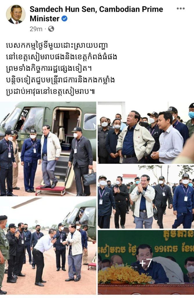 សម្ដេចតេជោ បានសរសេរលើទំព័រហ្វេសប៊ុកដូច្នេះថា៖ បេសកកម្មថ្ងៃទីមួយ ដោះស្រាយបញ្ហានៅខេត្តសៀមរាបផង និងខេត្តកំពង់ធំផង ព្រមទាំងកិច្ចការរដ្ឋផ្សេងទៀត។