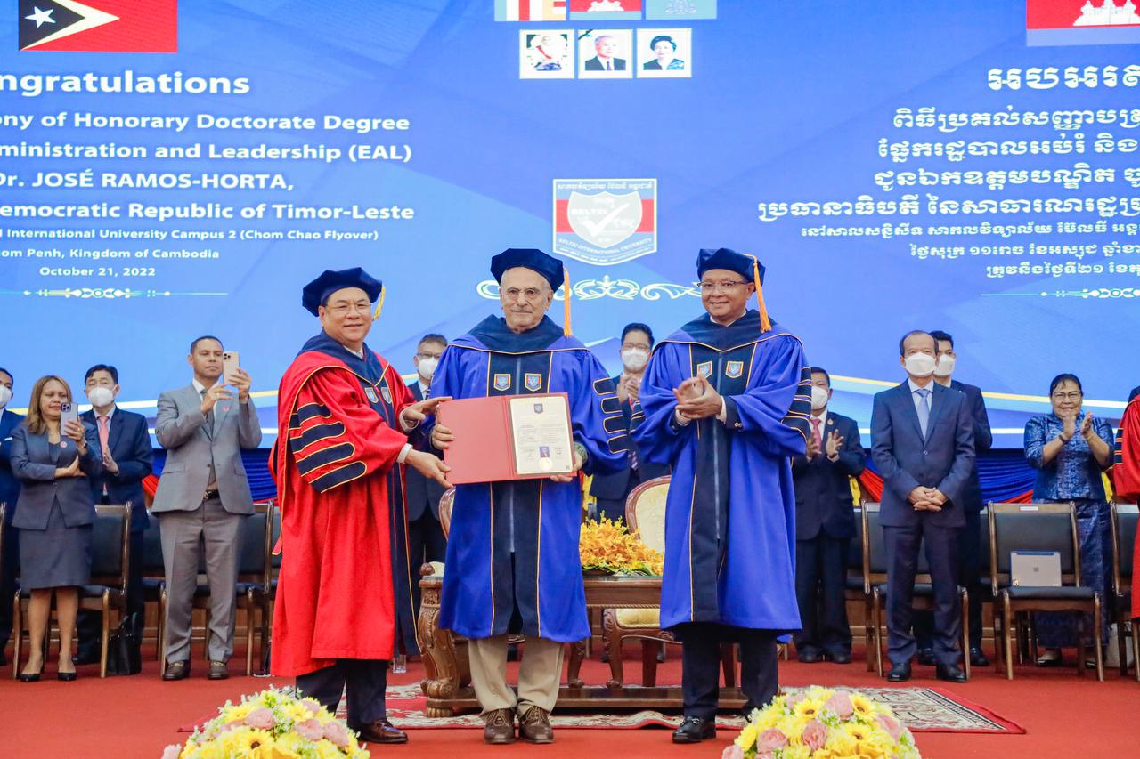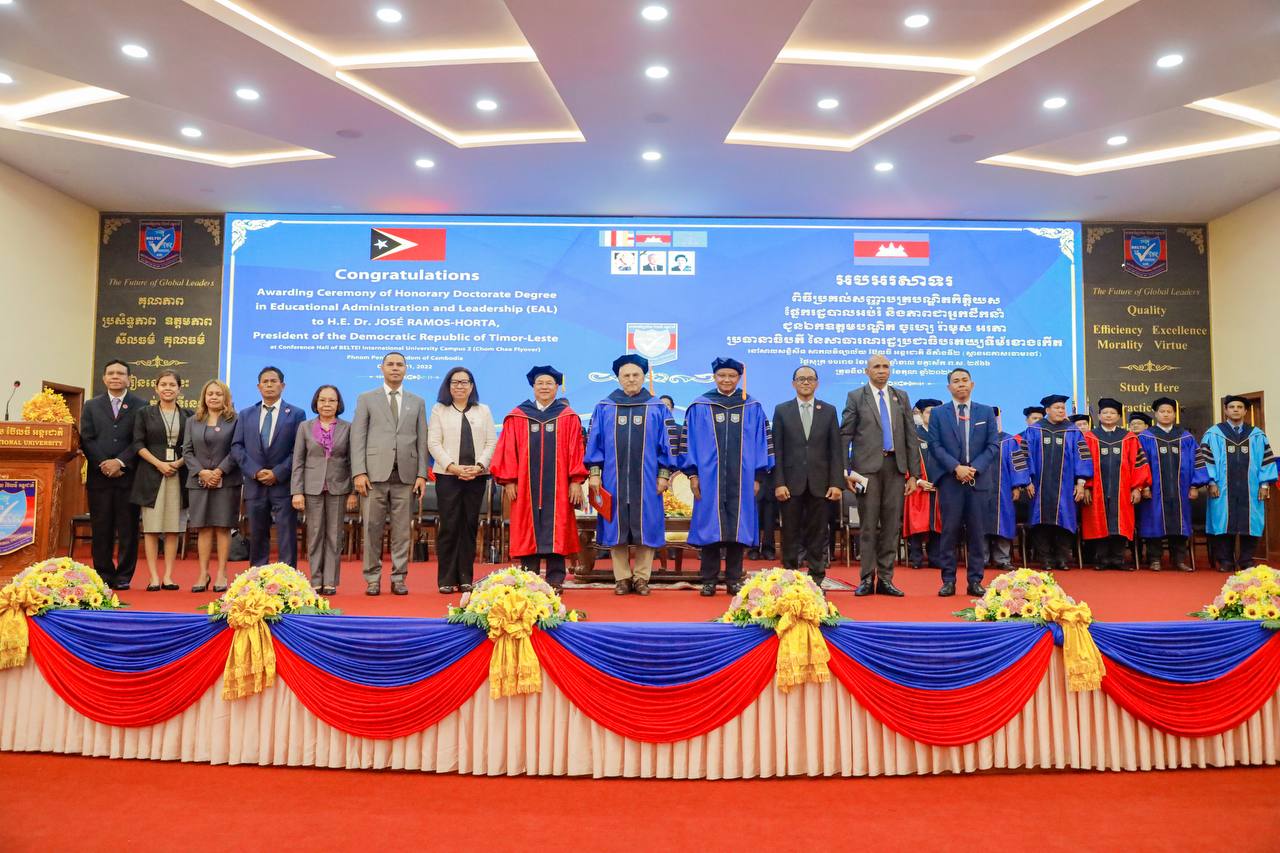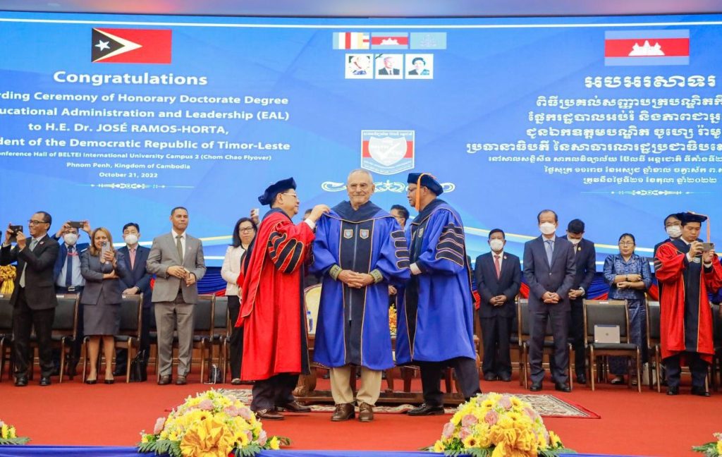ភ្នំពេញ៖ សាកលវិទ្យាល័យ ប៊ែលធី អន្តរជាតិ នាព្រឹកថ្ងៃទី២១ ខែតុលា ឆ្នាំ២០២២ បានរៀបចំពិធីប្រគល់សញ្ញាបត្របណ្ឌិតកិតិ្តយស «ផ្នែករដ្ឋបាលអប់រំ និងភាពជាអ្នកដឹកនាំ» (Honorary Doctorate Degree in Educational Administration and Leadership) ជូនឯកឧត្តមបណ្ឌិត ចូហ្សេ រ៉ាមូស អរតា (José Ramos-Horta) ប្រធានាធិបតី នៃសាធារណរដ្ឋប្រជាធិបតេយ្យ ទីម័រខាងកើត និងជាជ័យលាភីពានរង្វាន់ ណូប៊ែលសន្តិភាព (The Nobel Peace Prize) ក្រោមអធិបតីភាព ឯកឧត្តមបណ្ឌិតសភាចារ្យ ហង់ជួន ណារ៉ុន រដ្ឋមន្រ្តីក្រសួងអប់រំ យុវជន និងកីឡា។