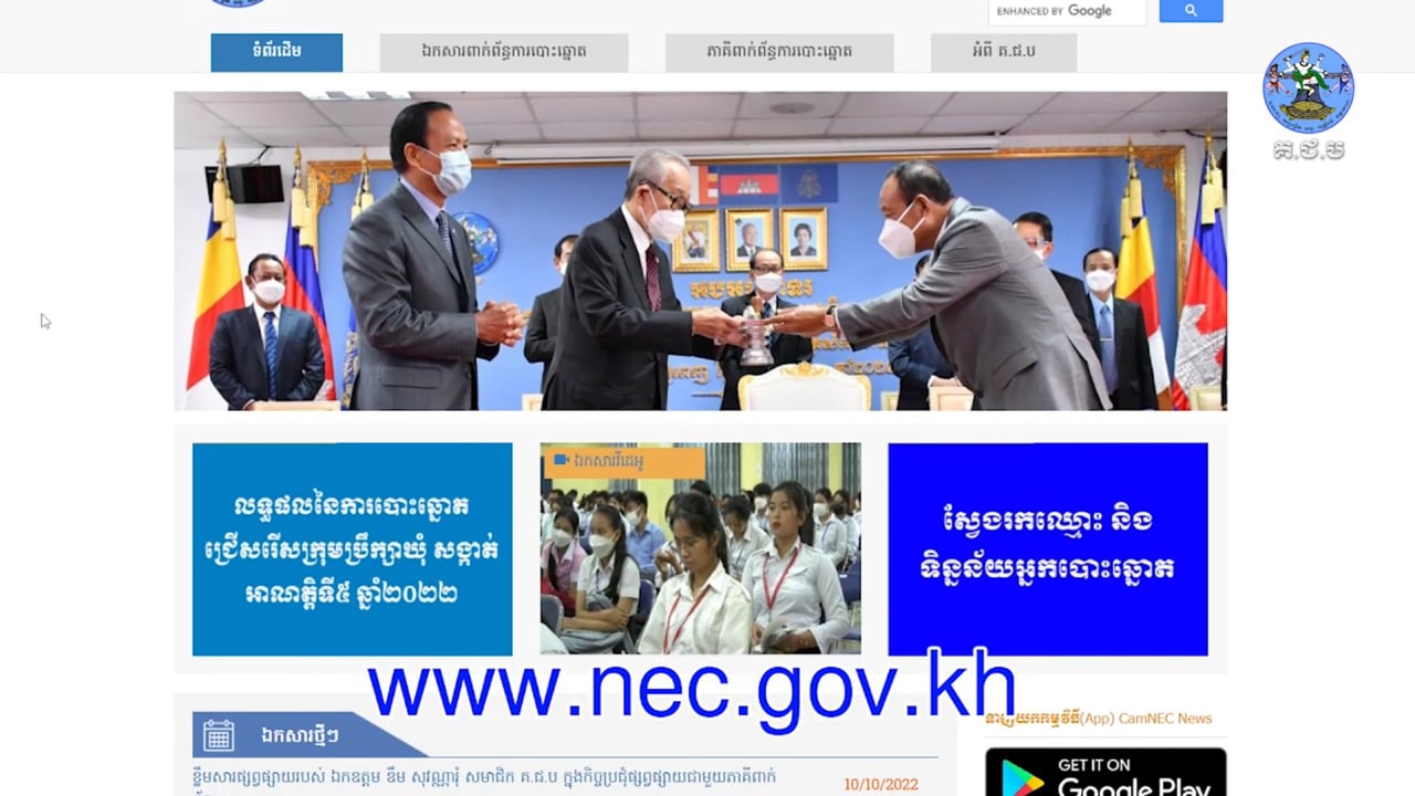 ភ្នំពេញ ៖ ការពិនិត្យបញ្ជីឈ្មោះ និងការចុះឈ្មោះបោះឆ្នោត ឆ្នាំ២០២២ មានរយៈពេល៥០ថ្ងៃ ដែលប្រព្រឹត្តទៅចាប់ពីថ្ងៃទី២០ ខែតុលា ដល់ថ្ងៃទី៨ ខែធ្នូ ឆ្នាំ២០២២ នៅតាមសាលាឃុំ សង្កាត់ និងនៅតាមភូមិមួយចំនួនក្នុងឃុំ សង្កាត់ទូទាំងប្រទេស។ សូមបងប្អូនប្រជាពលរដ្ឋ អញ្ជើញទៅពិនិត្យបញ្ជីឈ្មោះ និងចុះឈ្មោះបោះឆ្នោត។