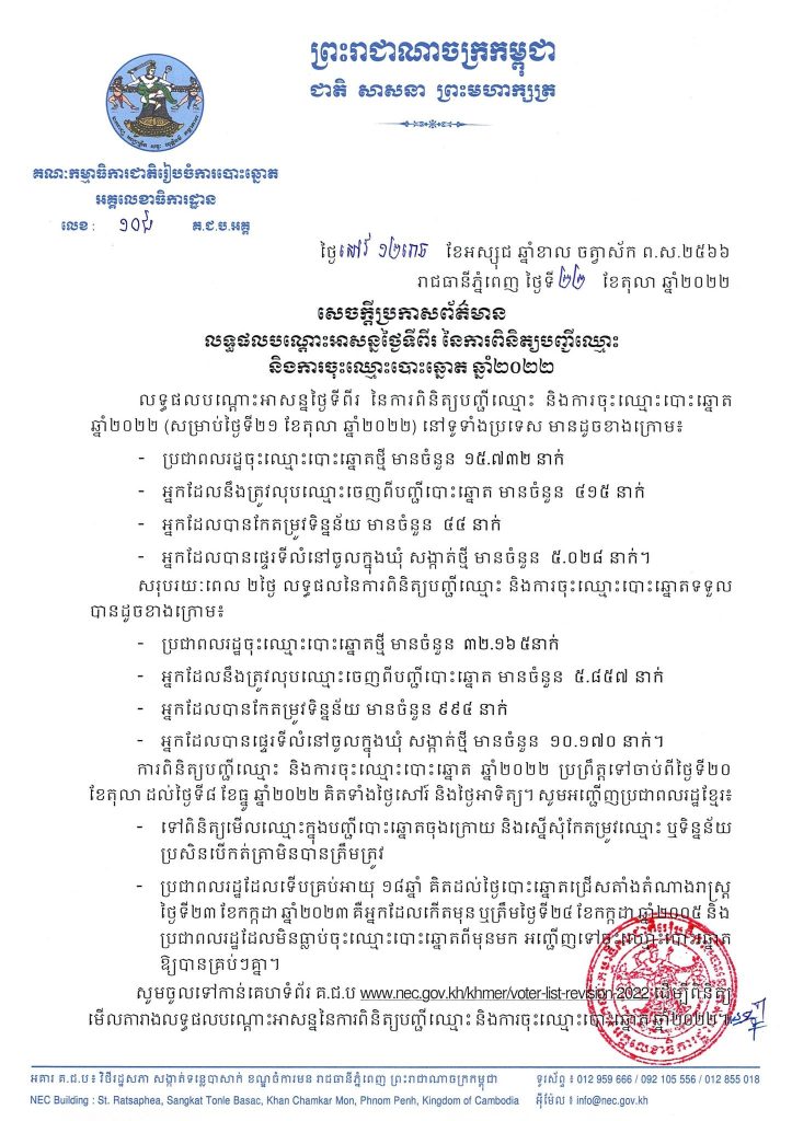 គ.ជ.ប បានបន្តថា សម្រាប់ថ្ងៃទី២១ ខែតុលា ឆ្នាំ២០២២ ការពិនិត្យបញ្ជីឈ្មោះ និងការចុះឈ្មោះបោះឆ្នោត ឆ្នាំ២០២២ នៅទូទាំងប្រទេសគឺមានប្រជាពលរដ្ឋចុះឈ្មោះបោះឆ្នោតថ្មី មានចំនួន១៥.៧៣២នាក់។ អ្នកដែលនឹងត្រូវលុបឈ្មោះចេញពីបញ្ជីបោះឆ្នោត មានចំនួន ៤១៥ នាក់។ អ្នកដែលបានកែតម្រូវទិន្នន័យ មានចំនួន ៤៤ នាក់។ អ្នកដែលបានផ្ទេរទីលំនៅចូលក្នុងឃុំ សង្កាត់ថ្មី មានចំនួន ៥.០២៨ នាក់។