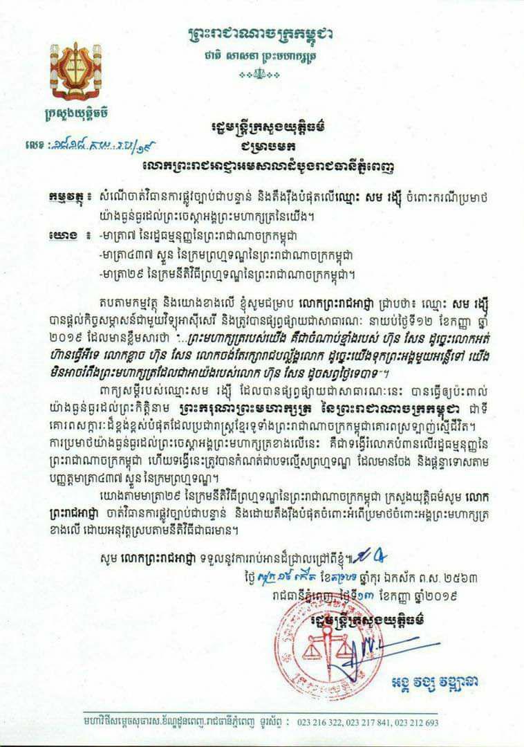 រដ្ឋមន្រ្តីក្រសួងយុត្តិធម៌ ចេញអធិបញ្ជាឱ្យអយ្យការអមសាលាដំបូងរាជធានីភ្នំពេញ ចាត់ការតាមផ្លូវច្បាប់ជាបន្ទាន់ និងតឹងរឹងបំផុតចំពោះទង្វើទណ្ឌិត សម រង្ស៊ី ប្រមាថអង្គព្រះមហាក្សត្រព័ត៌មានអត្ថបទដោយ៖Kien Sereyvuth Kien SereyvuthIT Technical Supportអត្ថបទមុនអត្ថបទបន្ទាប់