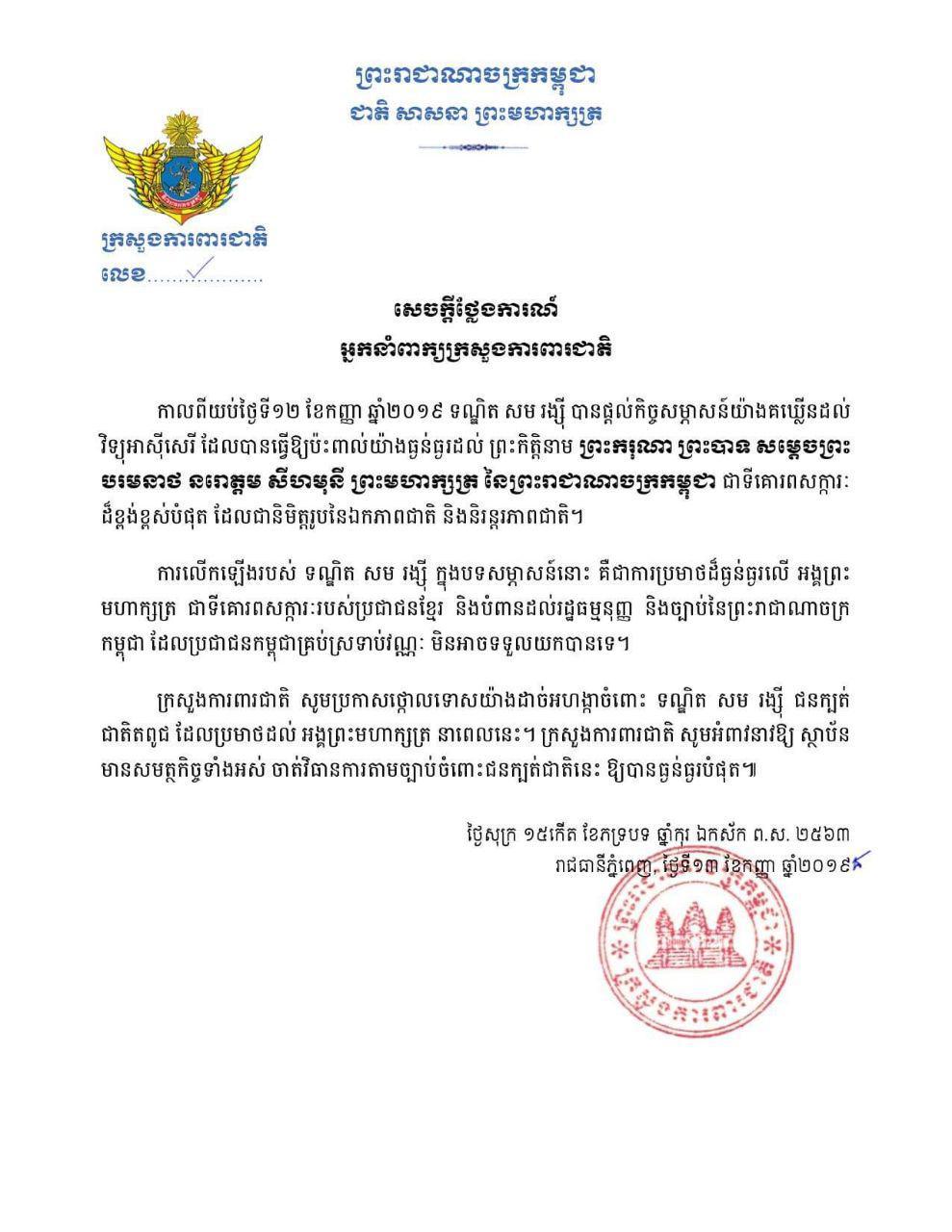 ក្រសួងការពារជាតិ ចេញសេចក្តីថ្លែងការណ៍ថ្កោលទោស និងប្រឆាំងដាច់ខាតចំពោះការអំពាវនាវរបស់ទណ្ឌិត សម រង្ស៉ីព័ត៌មានអត្ថបទដោយ៖Kien Sereyvuth Kien SereyvuthIT Technical Supportអត្ថបទមុនអត្ថបទបន្ទាប់