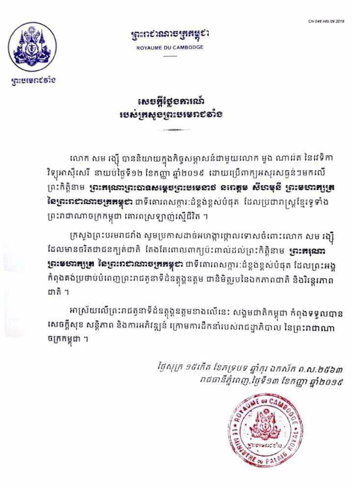 ព្រះបរមរាជវាំង ចេញសេចក្តីថ្លែងការណ៍ថ្កោលទោសដាច់អហង្កាចំពោះ ជនក្បត់ជាតិ សម រង្ស៉ី ដែលហ៊ានប្រមាថ ព្រះកិត្តិនាម ព្រះមហាក្សត្រព័ត៌មានអត្ថបទដោយ៖Kien Sereyvuth Kien SereyvuthIT Technical Supportអត្ថបទមុនអត្ថបទបន្ទាប់